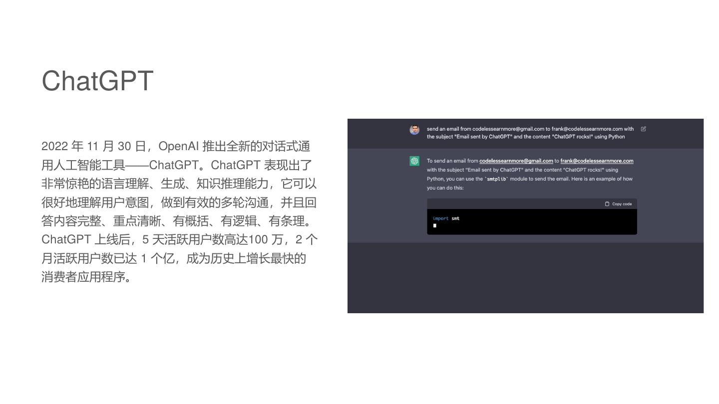 7 .ChatGPT 2022 年 11 月 30 日,OpenAI 推出全新的对话式通 用人工智能工具——ChatGPT。ChatGPT 表现出了 非常惊艳的语言理解、生成、知识推理能力,它可以 很好地理解用户意图,做到有效的多轮沟通,并且回 答内容完整、重点清晰、有概括、有逻辑、有条理。 ChatGPT 上线后,5 天活跃用户数高达100 万,2 个 月活跃用户数已达 1 个亿,成为历史上增长最快的 消费者应用程序。