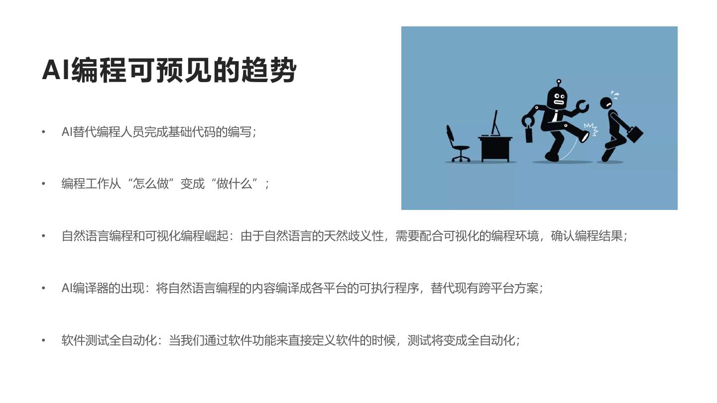 9 .AI编程可预见的趋势 • AI替代编程人员完成基础代码的编写; • 编程工作从“怎么做”变成“做什么”; • 自然语言编程和可视化编程崛起:由于自然语言的天然歧义性,需要配合可视化的编程环境,确认编程结果; • AI编译器的出现:将自然语言编程的内容编译成各平台的可执行程序,替代现有跨平台方案; • 软件测试全自动化:当我们通过软件功能来直接定义软件的时候,测试将变成全自动化;