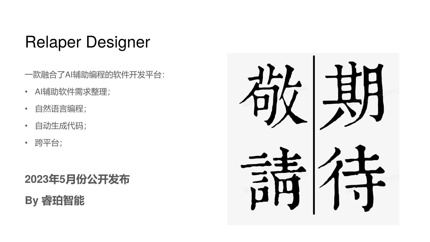 19 .Relaper Designer 一款融合了AI辅助编程的软件开发平台: • AI辅助软件需求整理; • 自然语言编程; • 自动生成代码; • 跨平台; 2023年5月份公开发布 By 睿珀智能