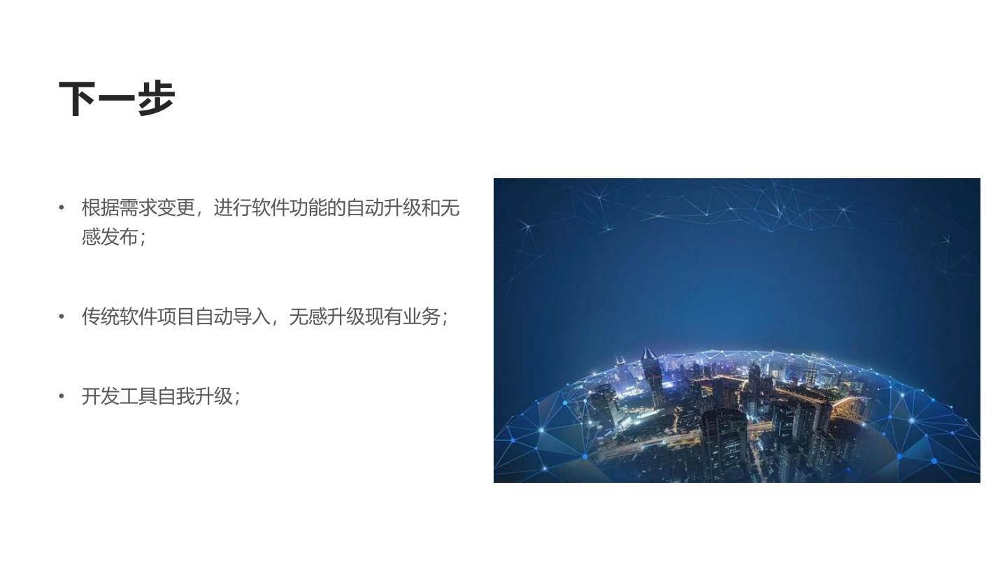 21 .下一步 • 根据需求变更,进行软件功能的自动升级和无 感发布; • 传统软件项目自动导入,无感升级现有业务; • 开发工具自我升级;