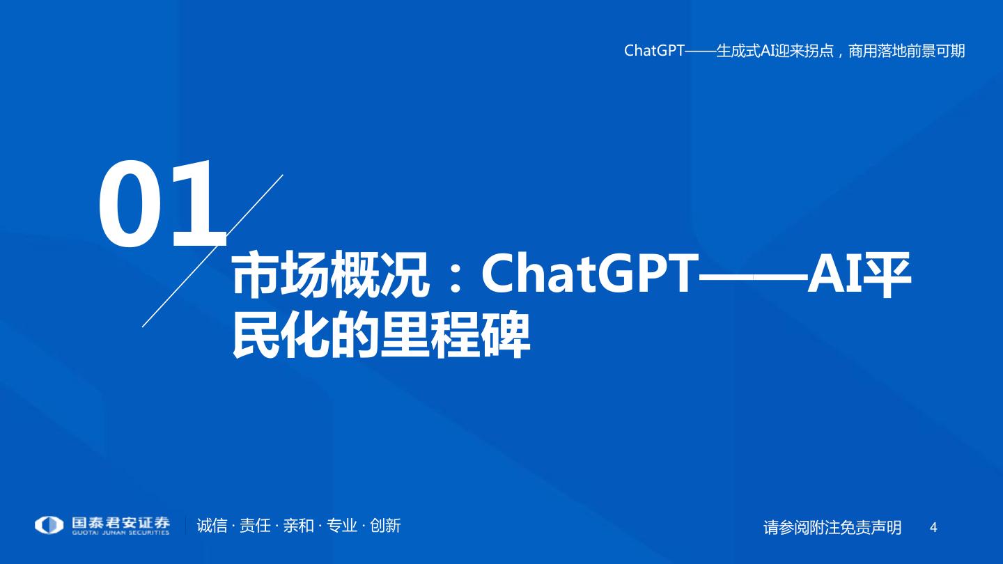 4 . ChatGPT——生成式AI迎来拐点,商用落地前景可期 01市场概况:ChatGPT——AI平 民化的里程碑 诚信 · 责任 · 亲和 · 专业 · 创新 请参阅附注免责声明 4