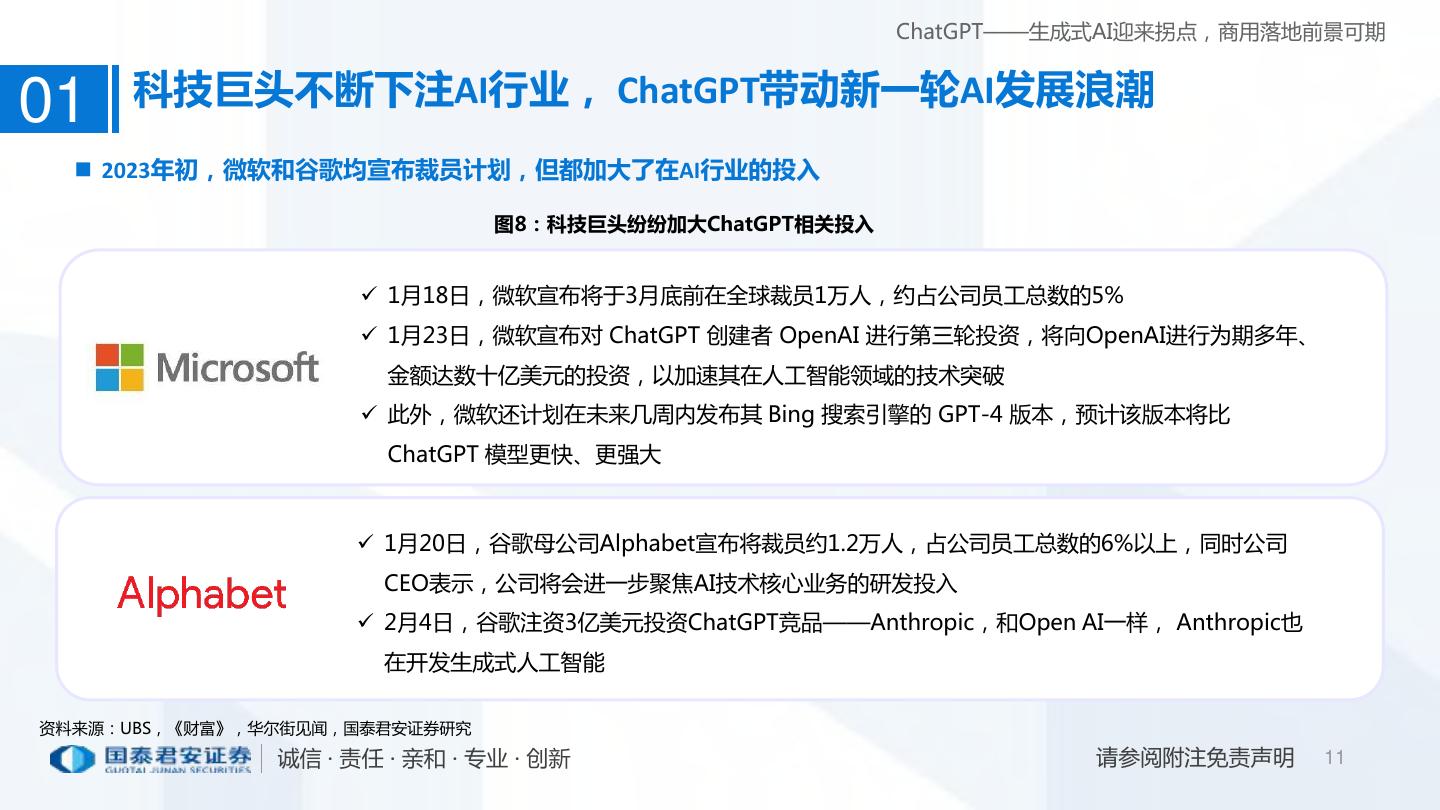 11 . ChatGPT——生成式AI迎来拐点,商用落地前景可期 01 科技巨头不断下注AI行业, ChatGPT带动新一轮AI发展浪潮 2023年初,微软和谷歌均宣布裁员计划,但都加大了在AI行业的投入 图8:科技巨头纷纷加大ChatGPT相关投入 1月18日,微软宣布将于3月底前在全球裁员1万人,约占公司员工总数的5% 1月23日,微软宣布对 ChatGPT 创建者 OpenAI 进行第三轮投资,将向OpenAI进行为期多年、 金额达数十亿美元的投资,以加速其在人工智能领域的技术突破 此外,微软还计划在未来几周内发布其 Bing 搜索引擎的 GPT-4 版本,预计该版本将比 ChatGPT 模型更快、更强大 1月20日,谷歌母公司Alphabet宣布将裁员约1.2万人,占公司员工总数的6%以上,同时公司 CEO表示,公司将会进一步聚焦AI技术核心业务的研发投入 2月4日,谷歌注资3亿美元投资ChatGPT竞品——Anthropic,和Open AI一样, Anthropic也 在开发生成式人工智能 资料来源:UBS,《财富》,华尔街见闻,国泰君安证券研究 诚信 · 责任 · 亲和 · 专业 · 创新 请参阅附注免责声明 11