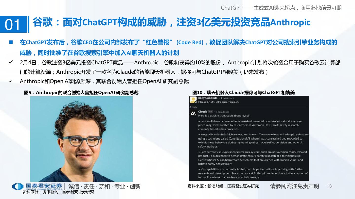 13 . ChatGPT——生成式AI迎来拐点,商用落地前景可期 01 谷歌:面对ChatGPT构成的威胁,注资3亿美元投资竞品Anthropic 在ChatGPT发布后,谷歌CEO在公司内部发布了“红色警报” (Code Red),敦促团队解决ChatGPT对公司搜索引擎业务构成的 威胁,同时批准了在谷歌搜索引擎中加入AI聊天机器人的计划 2月4日,谷歌注资3亿美元投资ChatGPT竞品——Anthropic,谷歌将获得约10%的股份, Anthropic计划将次轮资金用于购买谷歌云计算部 门的计算资源;Anthropic开发了一款名为Claude的智能聊天机器人,据称可与ChatGPT相媲美(仍未发布) Anthropic和Open AI渊源颇深,其联合创始人曾担任OpenAI 研究副总裁 图9:Anthropic的联合创始人曾担任OpenAI 研究副总裁 图10:聊天机器人Claude据称可与ChatGPT相媲美 诚信 · 责任 · 亲和 · 专业 · 创新 资料来源:新浪财经,国泰君安证券研究 请参阅附注免责声明 13 资料来源:腾讯新闻,国泰君安证券研究