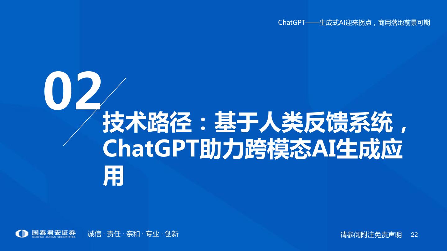 22 . ChatGPT——生成式AI迎来拐点,商用落地前景可期 02技术路径:基于人类反馈系统, ChatGPT助力跨模态AI生成应 用 诚信 · 责任 · 亲和 · 专业 · 创新 请参阅附注免责声明 22