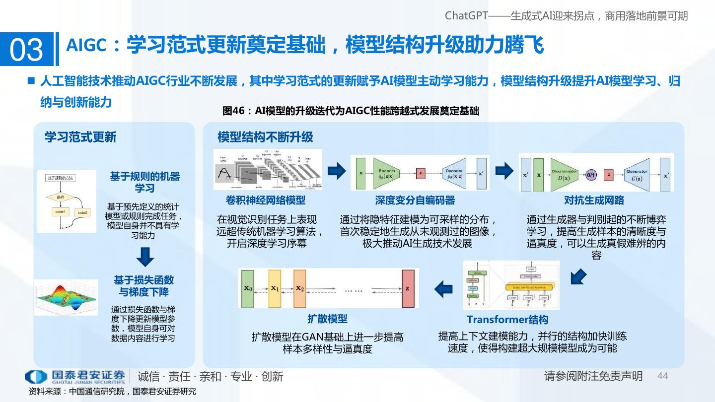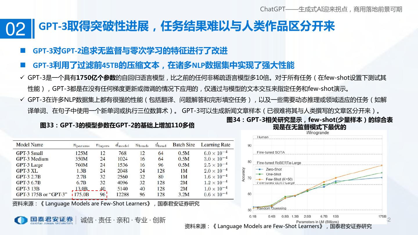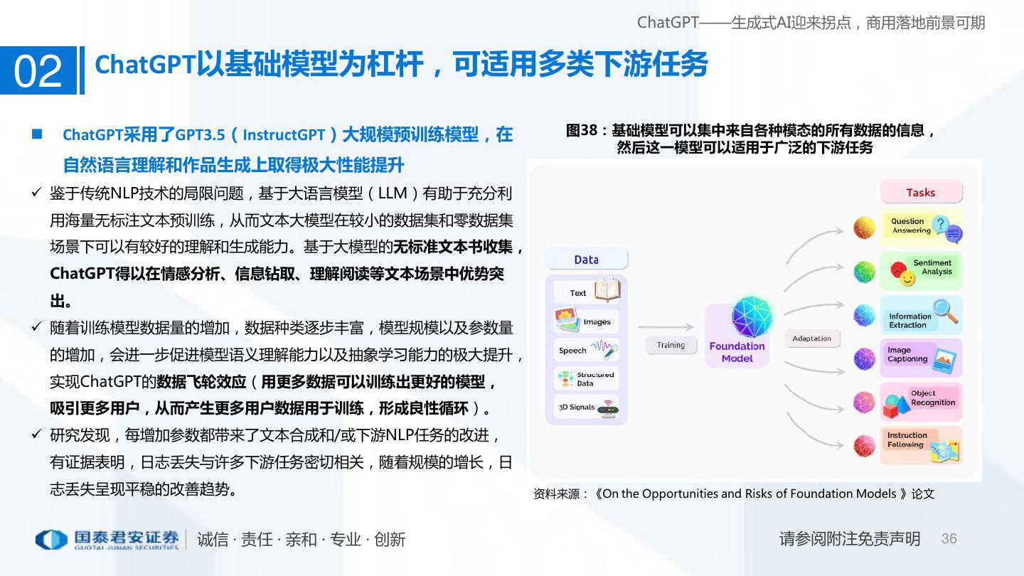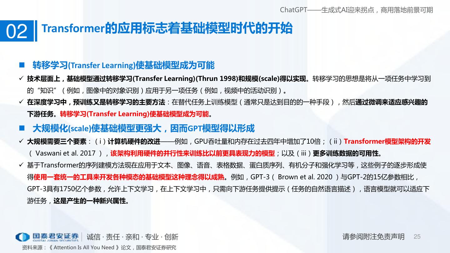 25 . ChatGPT——生成式AI迎来拐点,商用落地前景可期 02 Transformer的应用标志着基础模型时代的开始 转移学习(Transfer Learning)使基础模型成为可能 技术层面上,基础模型通过转移学习(Transfer Learning)(Thrun 1998)和规模(scale)得以实现。转移学习的思想是将从一项任务中学习到 的“知识”(例如,图像中的对象识别)应用于另一项任务(例如,视频中的活动识别)。 在深度学习中,预训练又是转移学习的主要方法:在替代任务上训练模型(通常只是达到目的的一种手段),然后通过微调来适应感兴趣的 下游任务。转移学习(Transfer Learning)使基础模型成为可能。 大规模化(scale)使基础模型更强大,因而GPT模型得以形成 大规模需要三个要素:(i)计算机硬件的改进——例如,GPU吞吐量和内存在过去四年中增加了10倍;(ii)Transformer模型架构的开发 ( Vaswani et al. 2017 ),该架构利用硬件的并行性来训练比以前更具表现力的模型;以及(iii)更多训练数据的可用性。 基于Transformer的序列建模方法现在应用于文本、图像、语音、表格数据、蛋白质序列、有机分子和强化学习等,这些例子的逐步形成使 得使用一套统一的工具来开发各种模态的基础模型这种理念得以成熟。例如,GPT-3( Brown et al. 2020 )与GPT-2的15亿参数相比, GPT-3具有1750亿个参数,允许上下文学习,在上下文学习中,只需向下游任务提供提示(任务的自然语言描述),语言模型就可以适应下 游任务,这是产生的一种新兴属性。 诚信 · 责任 · 亲和 · 专业 · 创新 请参阅附注免责声明 25 资料来源:《 Attention Is All You Need 》论文,国泰君安证券研究