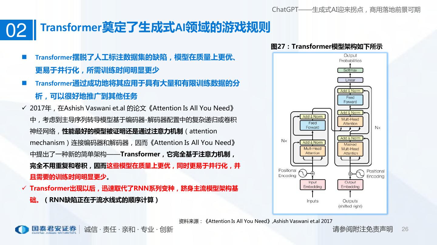 26 . ChatGPT——生成式AI迎来拐点,商用落地前景可期 02 Transformer奠定了生成式AI领域的游戏规则 图27:Transformer模型架构如下所示 Transformer摆脱了人工标注数据集的缺陷,模型在质量上更优、 更易于并行化,所需训练时间明显更少 Transformer通过成功地将其应用于具有大量和有限训练数据的分 析,可以很好地推广到其他任务 2017年,在Ashish Vaswani et.al 的论文《Attention Is All You Need》 中,考虑到主导序列转导模型基于编码器-解码器配置中的复杂递归或卷积 神经网络,性能最好的模型被证明还是通过注意力机制(attention mechanism)连接编码器和解码器,因而《Attention Is All You Need》 中提出了一种新的简单架构——Transformer,它完全基于注意力机制, 完全不用重复和卷积,因而这些模型在质量上更优,同时更易于并行化,并 且需要的训练时间明显更少。 Transformer出现以后,迅速取代了RNN系列变种,跻身主流模型架构基 础。(RNN缺陷正在于流水线式的顺序计算) 资料来源:《Attention Is All You Need》,Ashish Vaswani et.al 2017 诚信 · 责任 · 亲和 · 专业 · 创新 请参阅附注免责声明 26