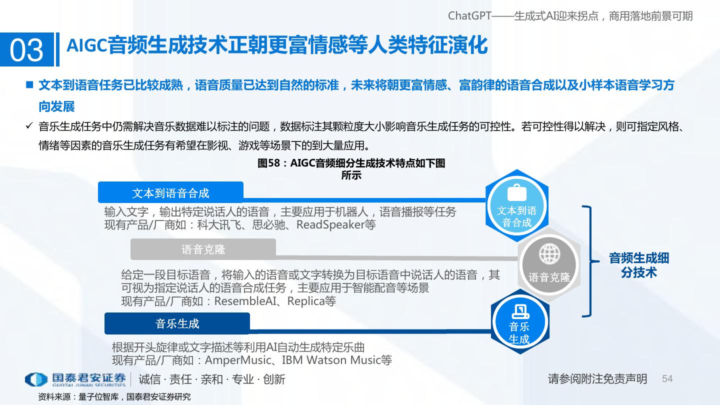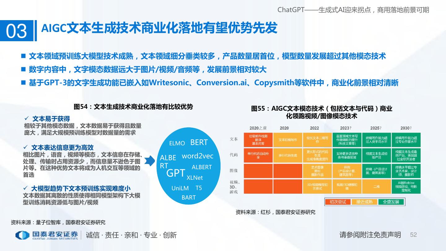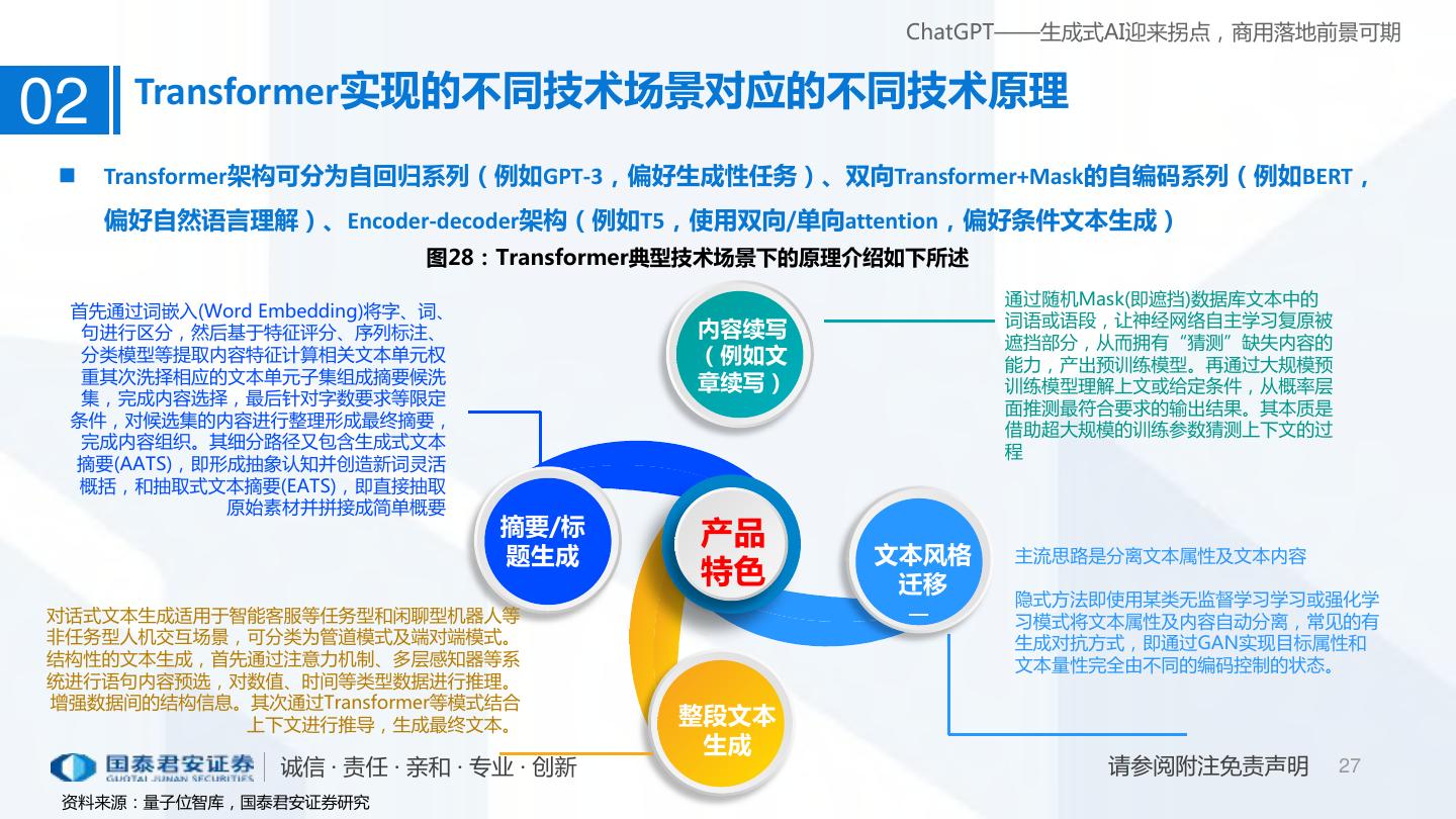 27 . ChatGPT——生成式AI迎来拐点,商用落地前景可期 02 Transformer实现的不同技术场景对应的不同技术原理 Transformer架构可分为自回归系列(例如GPT-3,偏好生成性任务)、双向Transformer+Mask的自编码系列(例如BERT, 偏好自然语言理解)、Encoder-decoder架构(例如T5,使用双向/单向attention,偏好条件文本生成) 图28:Transformer典型技术场景下的原理介绍如下所述 通过随机Mask(即遮挡)数据库文本中的 首先通过词嵌入(Word Embedding)将字、词、 词语或语段,让神经网络自主学习复原被 句进行区分,然后基于特征评分、序列标注、 内容续写 遮挡部分,从而拥有“猜测”缺失内容的 分类模型等提取内容特征计算相关文本单元权 (例如文 能力,产出预训练模型。再通过大规模预 重其次洗择相应的文本单元子集组成摘要候洗 章续写) 训练模型理解上文或给定条件,从概率层 集,完成内容选择,最后针对字数要求等限定 面推测最符合要求的输出结果。其本质是 条件,对候选集的内容进行整理形成最终摘要, 借助超大规模的训练参数猜测上下文的过 完成内容组织。其细分路径又包含生成式文本 程 摘要(AATS),即形成抽象认知并创造新词灵活 概括,和抽取式文本摘要(EATS),即直接抽取 原始素材并拼接成简单概要 摘要/标 产品 题生成 文本风格 主流思路是分离文本属性及文本内容 特色 迁移 隐式方法即使用某类无监督学习学习或强化学 对话式文本生成适用于智能客服等任务型和闲聊型机器人等 习模式将文本属性及内容自动分离,常见的有 非任务型人机交互场景,可分类为管道模式及端对端模式。 生成对抗方式,即通过GAN实现目标属性和 结构性的文本生成,首先通过注意力机制、多层感知器等系 文本量性完全由不同的编码控制的状态。 统进行语句内容预选,对数值、时间等类型数据进行推理。 增强数据间的结构信息。其次通过Transformer等模式结合 上下文进行推导,生成最终文本。 整段文本 生成 诚信 · 责任 · 亲和 · 专业 · 创新 请参阅附注免责声明 27 资料来源:量子位智库,国泰君安证券研究