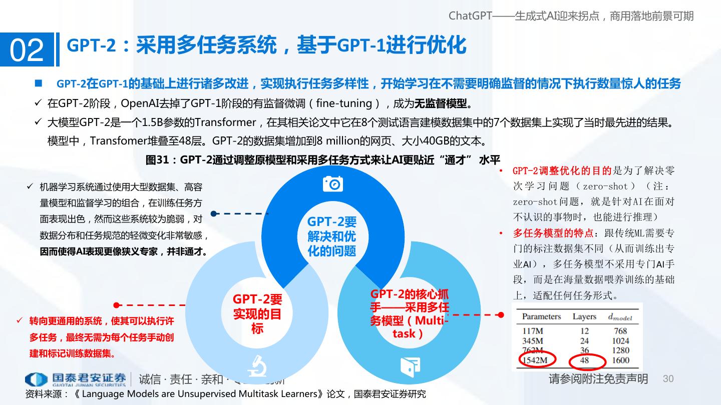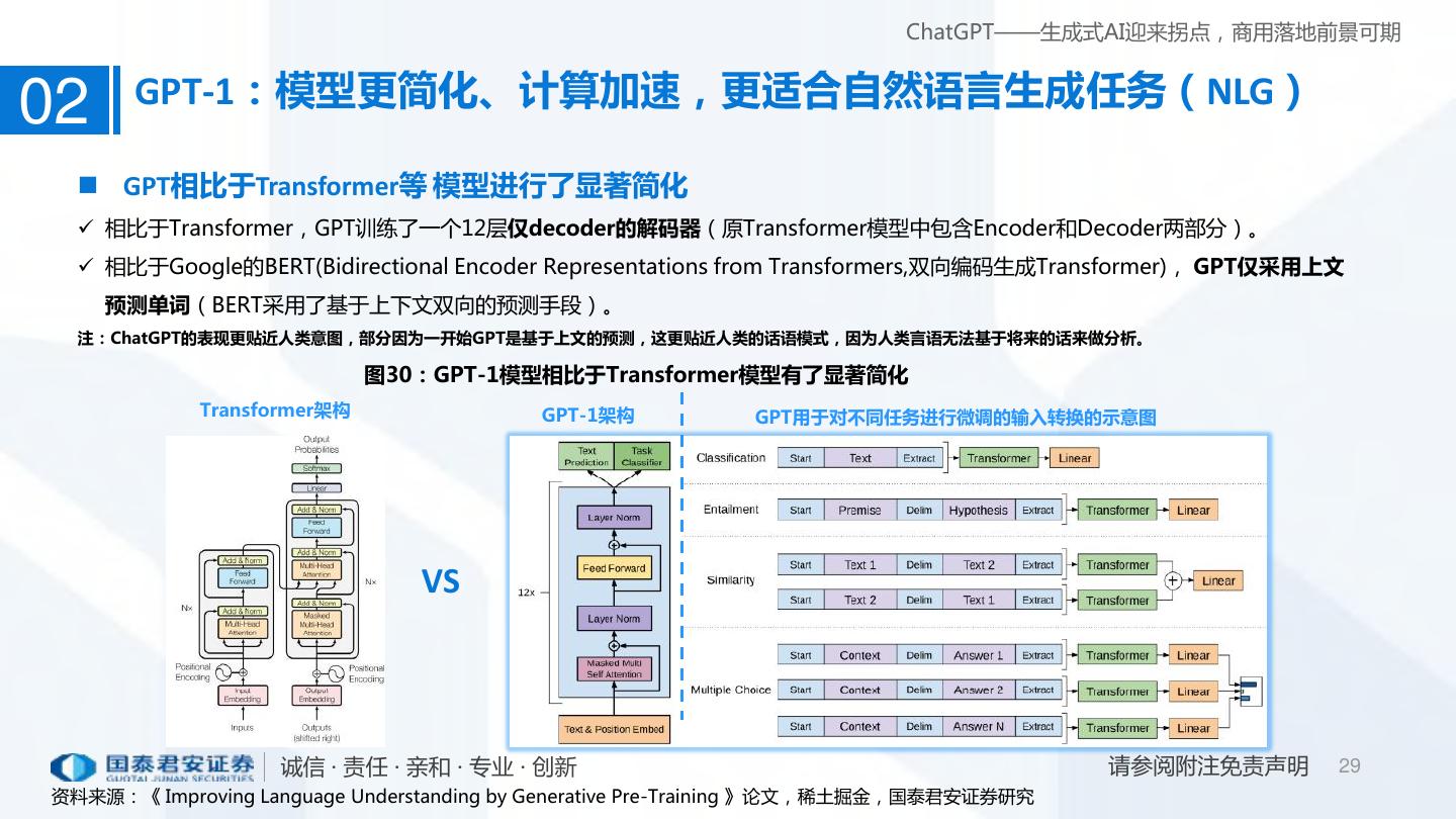 29 . ChatGPT——生成式AI迎来拐点,商用落地前景可期 02 GPT-1:模型更简化、计算加速,更适合自然语言生成任务(NLG) GPT相比于Transformer等 模型进行了显著简化 相比于Transformer,GPT训练了一个12层仅decoder的解码器(原Transformer模型中包含Encoder和Decoder两部分)。 相比于Google的BERT(Bidirectional Encoder Representations from Transformers,双向编码生成Transformer), GPT仅采用上文 预测单词(BERT采用了基于上下文双向的预测手段)。 注:ChatGPT的表现更贴近人类意图,部分因为一开始GPT是基于上文的预测,这更贴近人类的话语模式,因为人类言语无法基于将来的话来做分析。 图30:GPT-1模型相比于Transformer模型有了显著简化 Transformer架构 GPT-1架构 GPT用于对不同任务进行微调的输入转换的示意图 VS 诚信 · 责任 · 亲和 · 专业 · 创新 请参阅附注免责声明 29 资料来源:《 Improving Language Understanding by Generative Pre-Training 》论文,稀土掘金,国泰君安证券研究