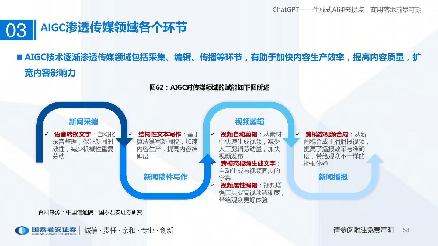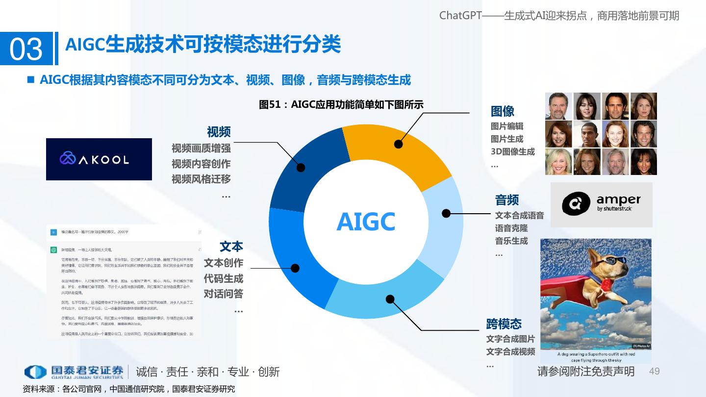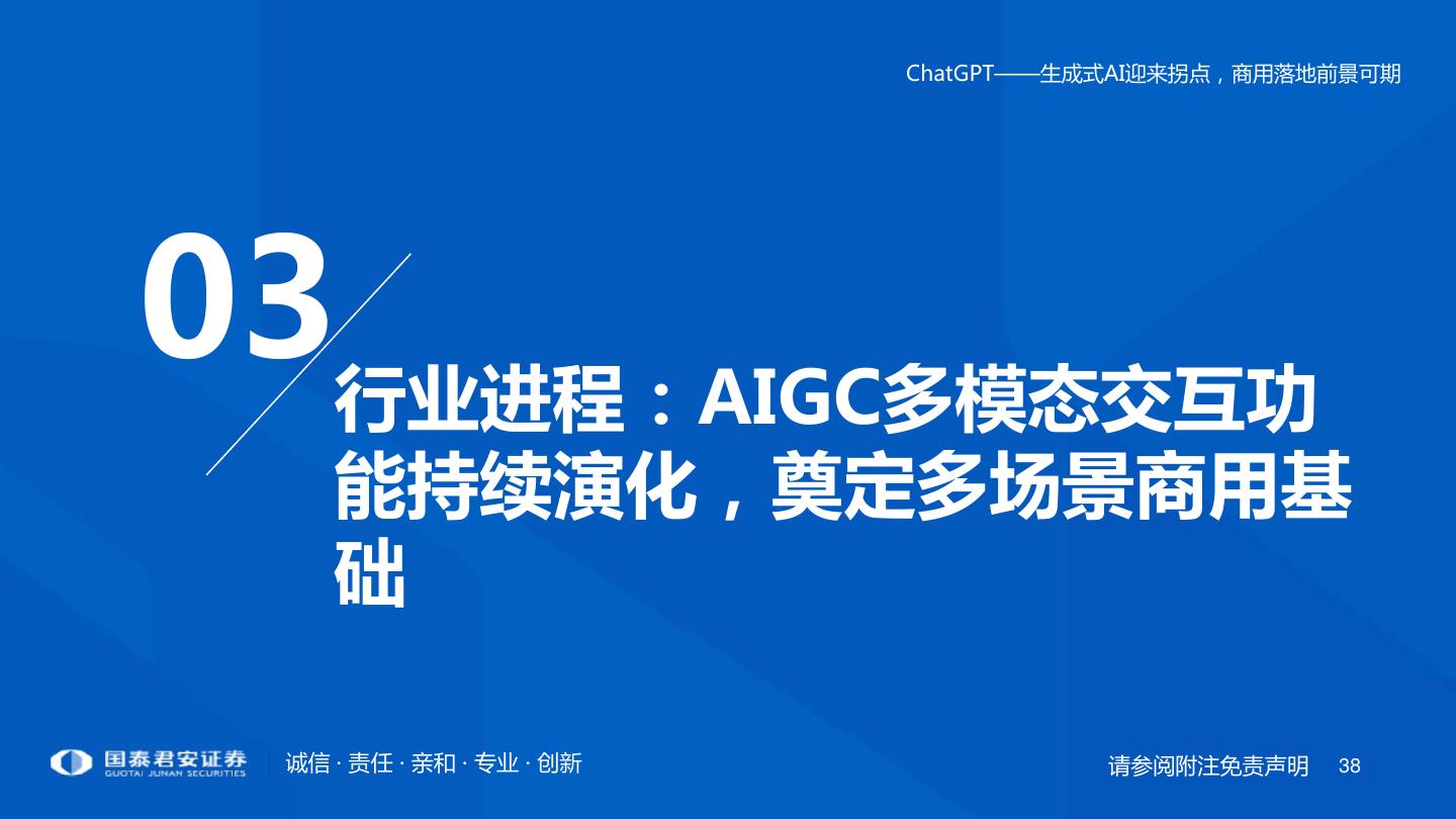 2 . ChatGPT——生成式AI迎来拐点,商用落地前景可期 摘要 ChatGPT市场反应热烈,国内外巨头纷纷入场 据统计,ChatGPT日活跃用户数的增速远超Instagram,1月份平均每天有超过1300万名独立访问者使用ChatGPT,是去年12月份的 01 两倍多;国内外科技巨头都非常重视ChatGPT引发的科技浪潮,积极布局生成式AI,国内厂商(百度、腾讯等)也高度关注ChatGPT, 积极探索前沿技术,相关深度应用也即将推出。 ChatGPT经历多类技术路线演化,逐步成熟与完善 02 ChatGPT所能实现的人类意图,来自于机器学习、神经网络以及Transformer模型的多种技术模型积累。Transformer建模方法成熟 以后,使用一套统一的工具来开发各种模态的基础模型这种理念得以成熟,随后GPT-1、GPT-2、GPT-3模型持续演化升级,最终孵 化出ChatGPT文本对话应用。 03 AIGC跨模态产业生态逐步成熟,商用落地未来可期 AIGC产业生态当前在文本、音频、视频等多模态交互功能上持续演化升级,奠定了多场景的商用基础。跨模态生成技术也有望成为真 正实现认知和决策智能的转折点。 ChatGPT乘东风,商业架构日益清晰 04 随着ChatGPT Plus发布,商业化序幕已经拉开。ChatGPT在传媒、影视、营销、娱乐以及数实共生助力产业升级等领域均可产生极大 助益,提升生产力曲线,多维度赋能虚拟经济和实体经济。 诚信 · 责任 · 亲和 · 专业 · 创新 请参阅附注免责声明 2