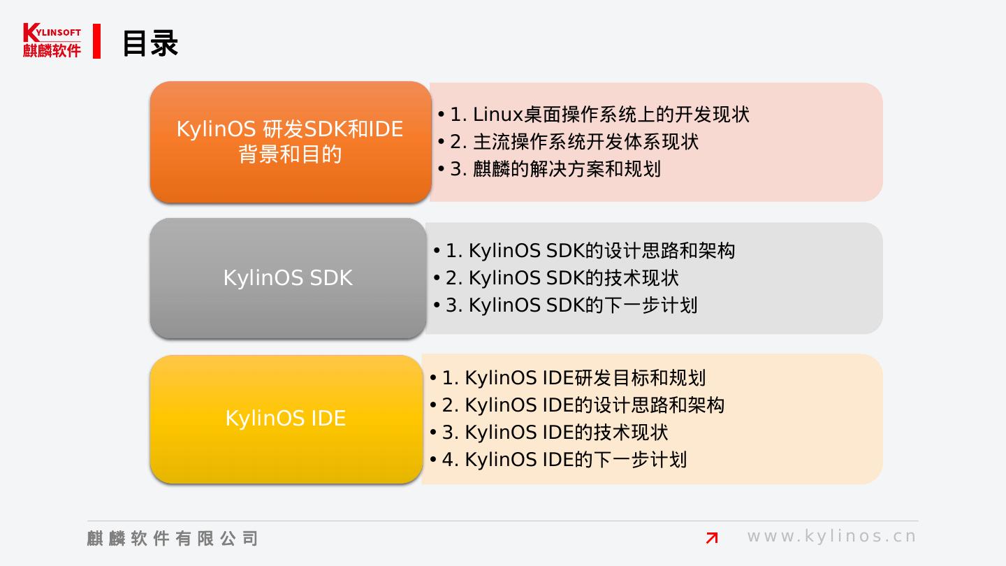 2 . 目录 • 1. Linux桌面操作系统上的开发现状 KylinOS 研发SDK和IDE • 2. 主流操作系统开发体系现状 背景和目的 • 3. 麒麟的解决方案和规划 • 1. KylinOS SDK的设计思路和架构 KylinOS SDK • 2. KylinOS SDK的技术现状 • 3. KylinOS SDK的下一步计划 • 1. KylinOS IDE研发目标和规划 • 2. KylinOS IDE的设计思路和架构 KylinOS IDE • 3. KylinOS IDE的技术现状 • 4. KylinOS IDE的下一步计划 麒麟软件有限公司 w w w. k y l i n o s . c n