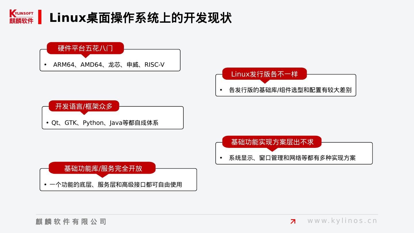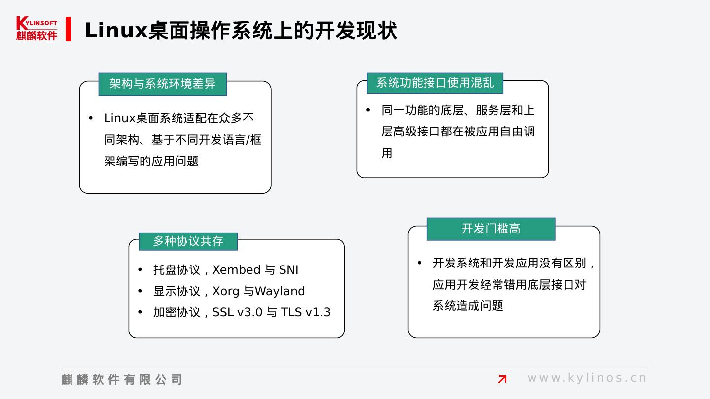 3 . Linux桌面操作系统上的开发现状 硬件平台五花八门 • ARM64、AMD64、龙芯、申威、RISC-V Linux发行版各不一样 • 各发行版的基础库/组件选型和配置有较大差别 开发语言/框架众多 • Qt、GTK、Python、Java等都自成体系 基础功能实现方案层出不求 • 系统显示、窗口管理和网络等都有多种实现方案 基础功能库/服务完全开放 • 一个功能的底层、服务层和高级接口都可自由使用 麒麟软件有限公司 w w w. k y l i n o s . c n
