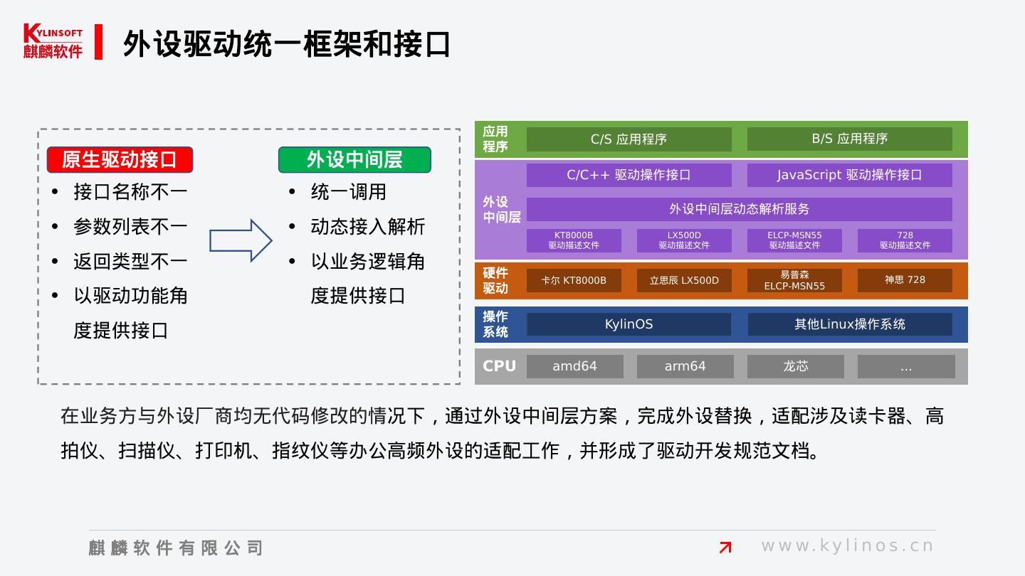 12 . 外设驱动统一框架和接口 应用 C/S 应用程序 B/S 应用程序 程序 原生驱动接口 外设中间层 C/C++ 驱动操作接口 JavaScript 驱动操作接口 • 接口名称不一 • 统一调用 外设 外设中间层动态解析服务 • 参数列表不一 • 动态接入解析 中间层 KT8000B LX500D ELCP-MSN55 728 驱动描述文件 驱动描述文件 驱动描述文件 驱动描述文件 • 返回类型不一 • 以业务逻辑角 硬件 易普森 卡尔 KT8000B 立思辰 LX500D 神思 728 ELCP-MSN55 • 以驱动功能角 驱动 度提供接口 操作 KylinOS 其他Linux操作系统 度提供接口 系统 CPU amd64 arm64 龙芯 ... 在业务方与外设厂商均无代码修改的情况下,通过外设中间层方案,完成外设替换,适配涉及读卡器、高 拍仪、扫描仪、打印机、指纹仪等办公高频外设的适配工作,并形成了驱动开发规范文档。 麒麟软件有限公司 w w w. k y l i n o s . c n