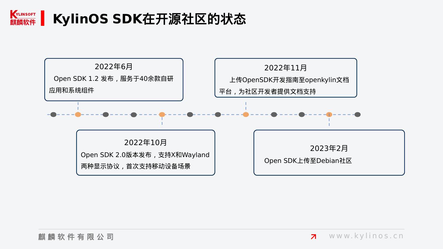 16 . KylinOS SDK的下一步计划 SDK v2.0 在完成SDK整体架构设计的 2024年 v4.0: 基础上,重点在图形支撑、 设备驱动、系统安全和基础 实现完整系统SDK架构,覆 系统模块覆盖实现SDK 盖麒麟系统所有功能模块; 2023年 v3.0: 2025年 v5.0: 实现通用开发领域中几个垂 SDK作为KylinOS的底层支 直领域的覆盖支撑,垂直领 撑能力,完成与QT、Java、 域内开发者能够使用开源框 Flutter等开发框架深度对接, 架 + SDK完整完成应用开 形成一套完整的开源Linux 发工作; 桌面系统SDK 输入法管 软硬件标 理框架 准化规范 UI交互框 ... 架 KylinOS SDK 麒麟软件有限公司 w w w. k y l i n o s . c n