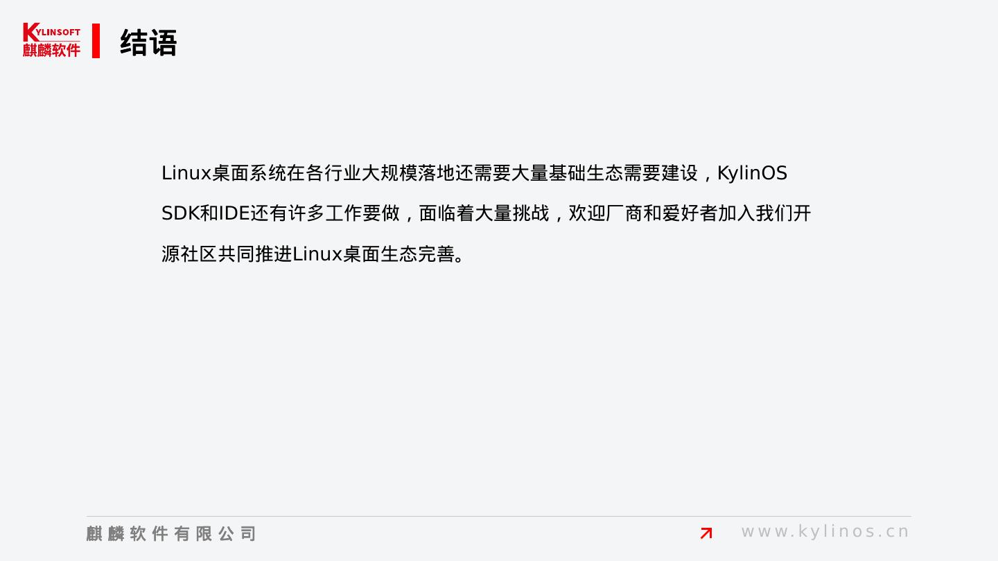 28 . 结语 Linux桌面系统在各行业大规模落地还需要大量基础生态需要建设,KylinOS SDK和IDE还有许多工作要做,面临着大量挑战,欢迎厂商和爱好者加入我们开 源社区共同推进Linux桌面生态完善。 麒麟软件有限公司 w w w. k y l i n o s . c n