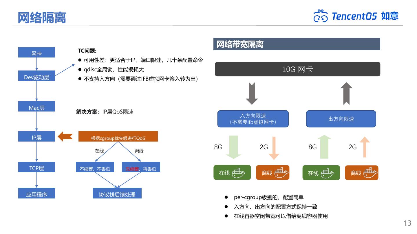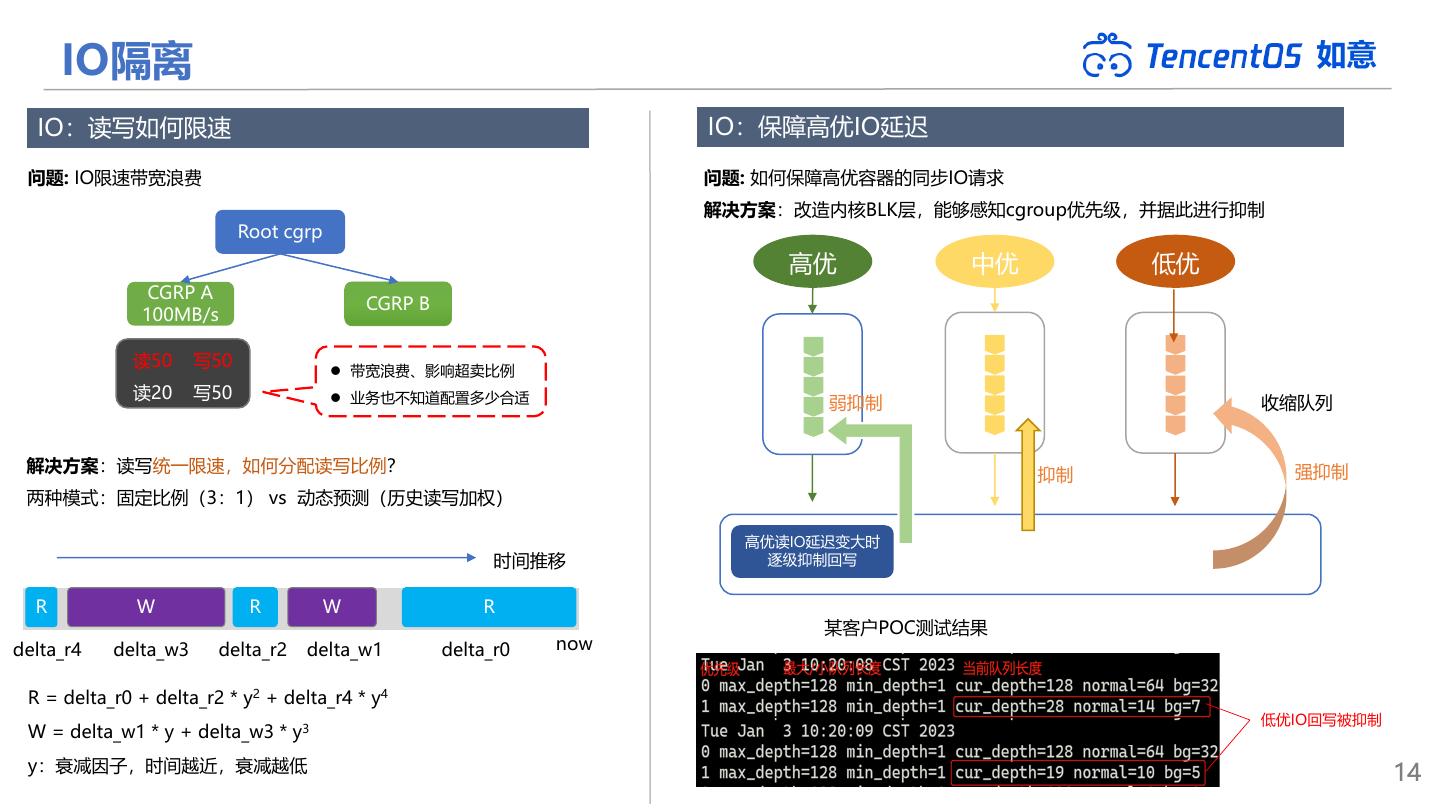 13 .网络隔离 如意 网络带宽隔离 TC问题: 网卡 ⚫ 可用性差:更适合于IP、端口限速,几十条配置命令 ⚫ qdisc全局锁,性能损耗大 10G 网卡 Dev驱动层 ⚫ 不支持入方向(需要通过IFB虚拟网卡将入转为出) Mac层 解决方案:IP层QoS限速 入方向限速 出方向限速 (不需要ifb虚拟网卡) IP层 根据cgroup优先级进行QoS 在线 离线 8G 2G 8G 2G TCP层 不缩窗、不丢包 先缩窗、再丢包 在线 离线 在线 离线 应用程序 协议栈后续处理 ⚫ per-cgroup级别的,配置简单 ⚫ 入方向、出方向的配置方式保持一致 ⚫ 在线容器空闲带宽可以借给离线容器使用 13