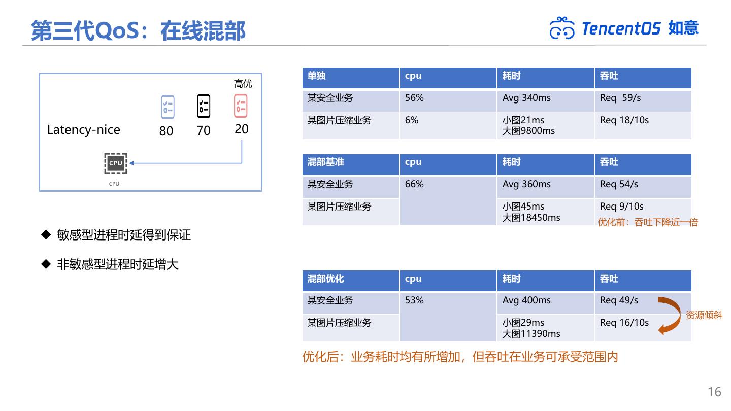 10 .CPU QoS:硬件干扰的解决 如意 负载均衡干扰 超线程干扰 在线 在线 在线 离线 离线 离线 CPU 0 CPU 1 CPU 0 CPU 1 L2 Cache 进程迁移代价递增 L1 cache L2 cache L3 cache 驱逐 i cache、d cache 内存 在线 离线 在线 离线 CPU0 CPU1 CPU2 CPU3 CPU4 CPU5 CPU6 CPU7 Core 0 Core 1 Core 2 Core 3 CPU0 CPU1 CPU2 CPU3 CPU0 CPU1 CPU2 CPU3 Socket 0 Socket 1 Core 0 Core 1 Core 0 Core 1 解决方案: 解决方案: ⚫ 离线单独负载均衡,和内核CFS负载均衡解耦 ⚫ 超线程跑在线进程时,驱逐兄弟超线程上的离线进程 在线 ⚫ 兄弟超线程100%空闲,完全避免超线程干扰 离线 CPU 0 CPU 1 引入新的问题:超线程资源浪费 10
