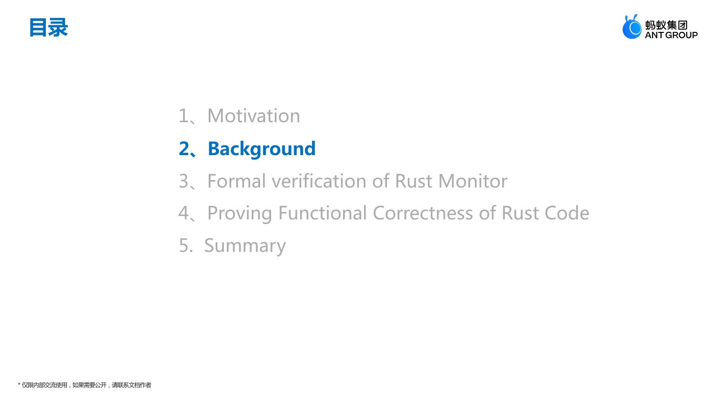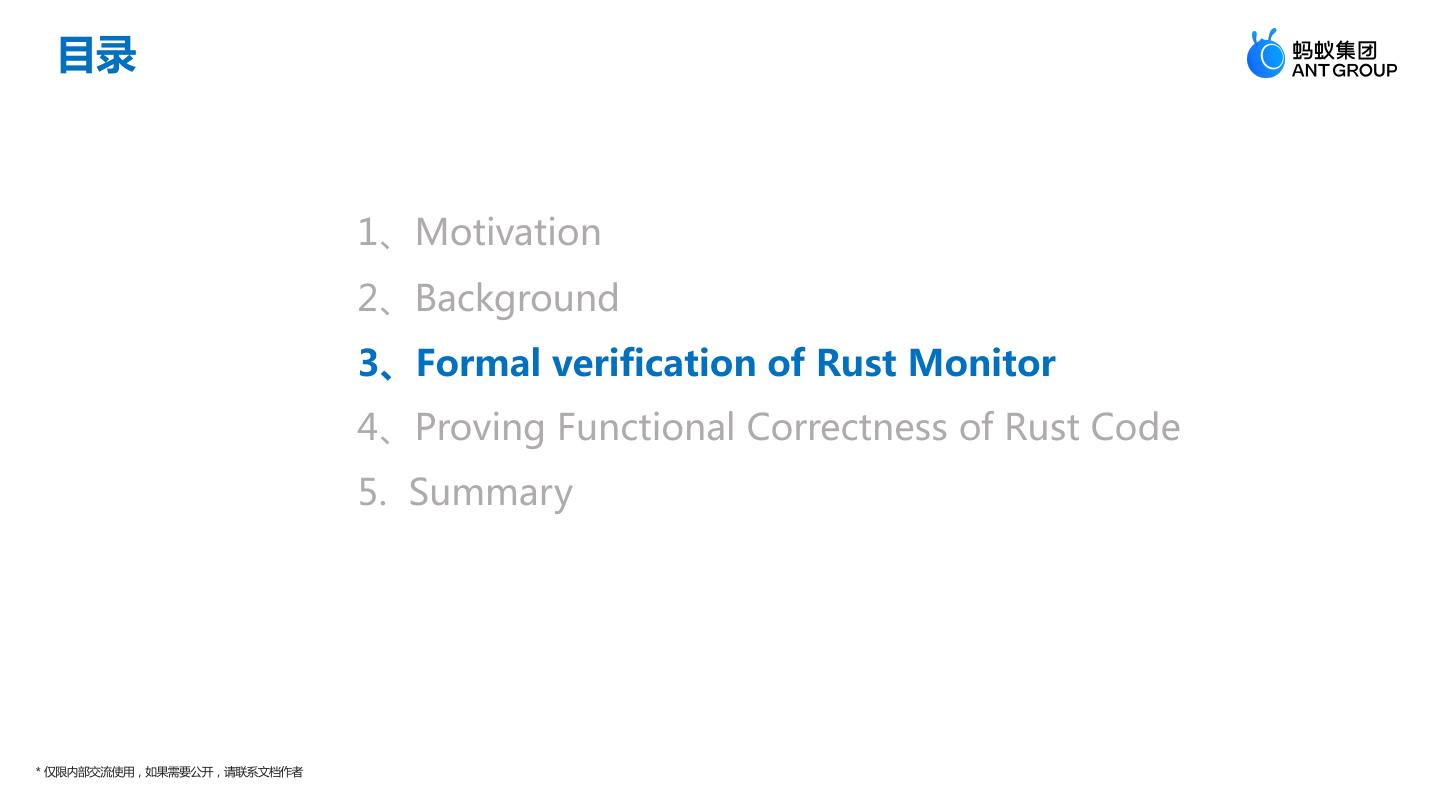 2 . 目录 1、Motivation 2、Background 3、Formal verification of Rust Monitor 4、Proving Functional Correctness of Rust Code 5. Summary * 仅限内部交流使用,如果需要公开,请联系文档作者