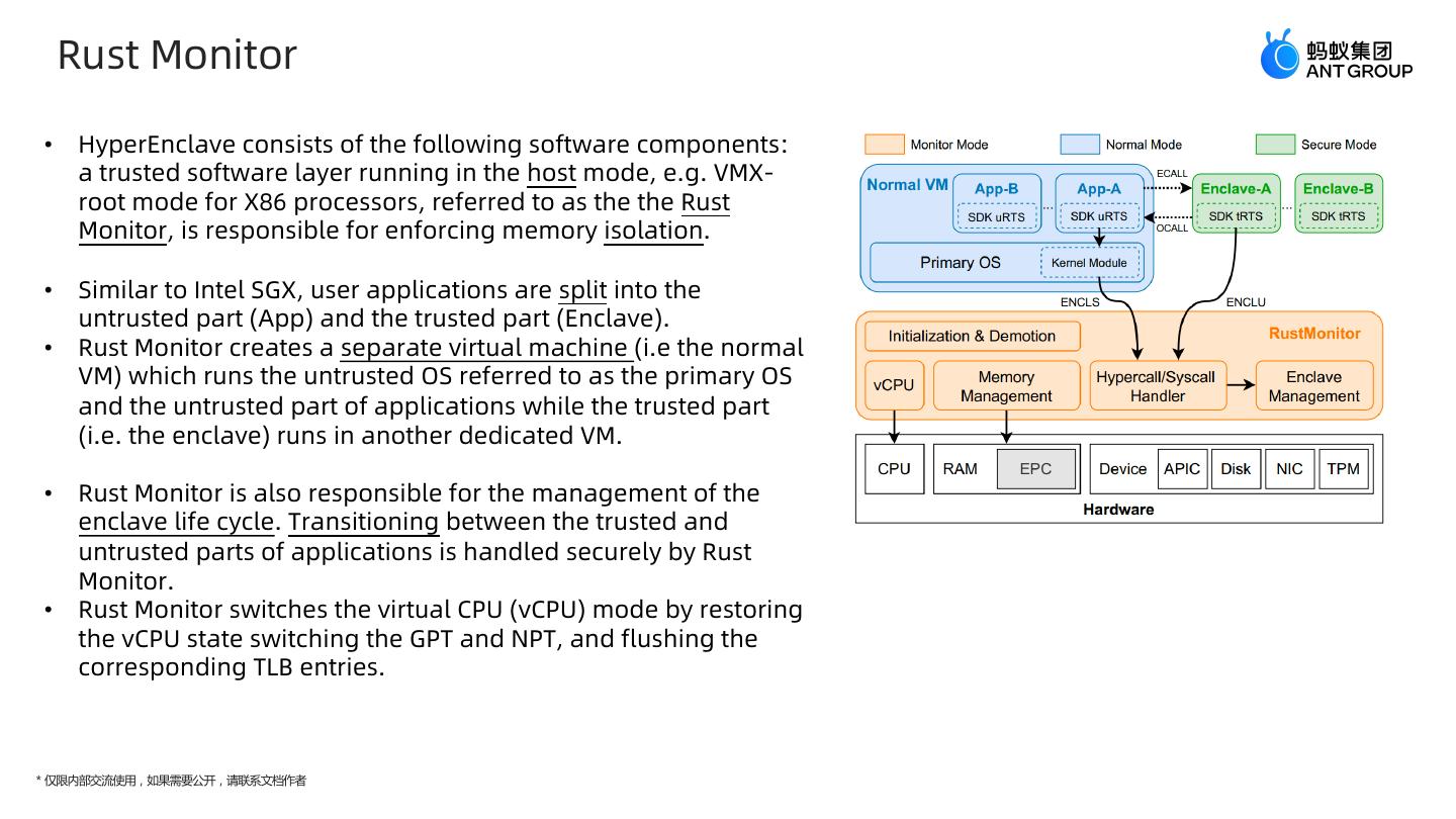 8 . Rust Monitor • HyperEnclave consists of the following software components: a trusted software layer running in the host mode, e.g. VMX- root mode for X86 processors, referred to as the the Rust Monitor, is responsible for enforcing memory isolation. • Similar to Intel SGX, user applications are split into the untrusted part (App) and the trusted part (Enclave). • Rust Monitor creates a separate virtual machine (i.e the normal VM) which runs the untrusted OS referred to as the primary OS and the untrusted part of applications while the trusted part (i.e. the enclave) runs in another dedicated VM. • Rust Monitor is also responsible for the management of the enclave life cycle. Transitioning between the trusted and untrusted parts of applications is handled securely by Rust Monitor. • Rust Monitor switches the virtual CPU (vCPU) mode by restoring the vCPU state switching the GPT and NPT, and flushing the corresponding TLB entries. * 仅限内部交流使用,如果需要公开,请联系文档作者