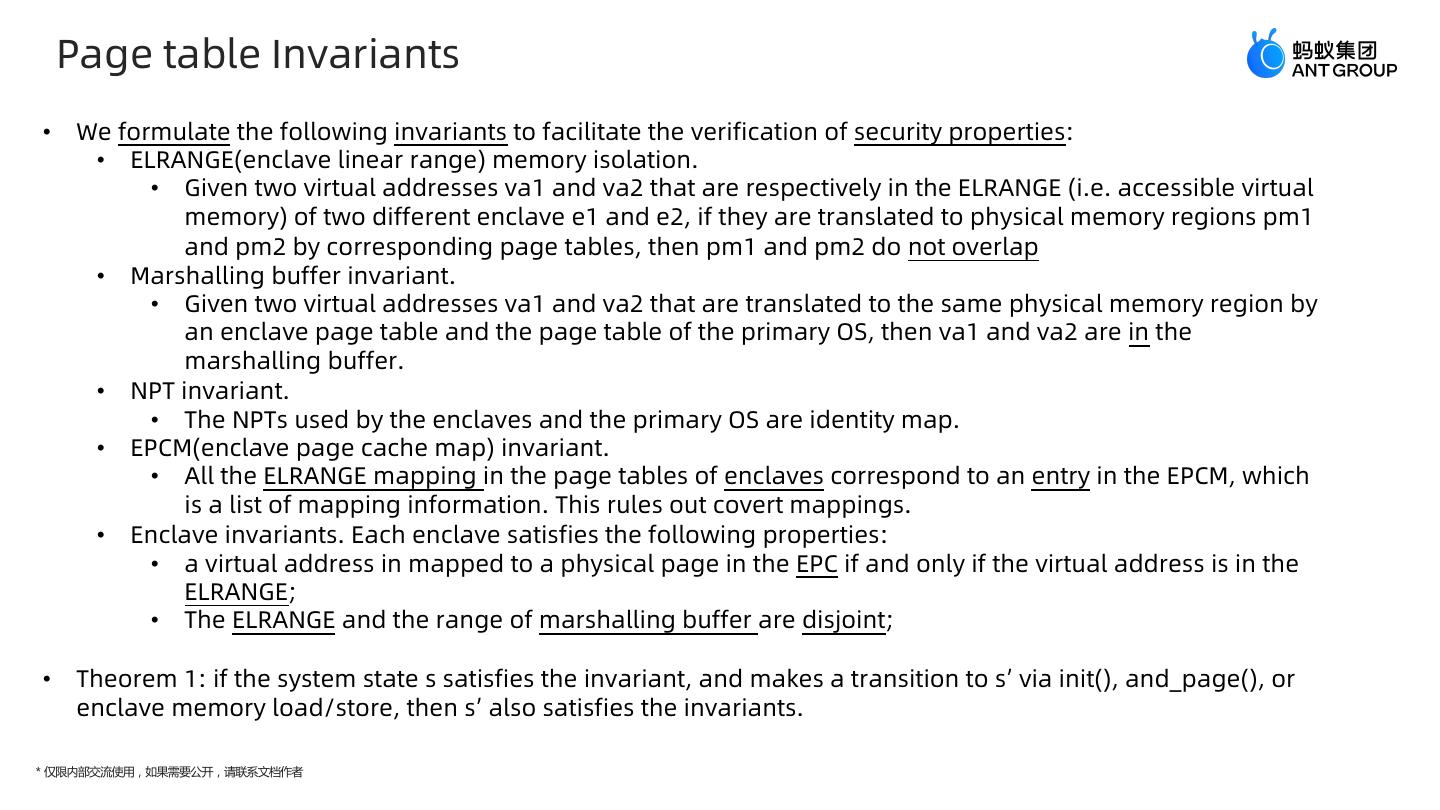 13 . Page table Invariants • The most subtle part of the Rust Monitor design the invariant that the page table mapping must satisfy. • These guard against two types of attack • First, if two different enclaves could address the same EPC page they could interfere with each other (alias attack). • if a virtual address which appears to not be part of the enclave were actually mapped to a physical EPC address, an enclave could be fooled into writing into each own EPC page when it believes it is accessing normal memory (remapping attack). * 仅限内部交流使用,如果需要公开,请联系文档作者