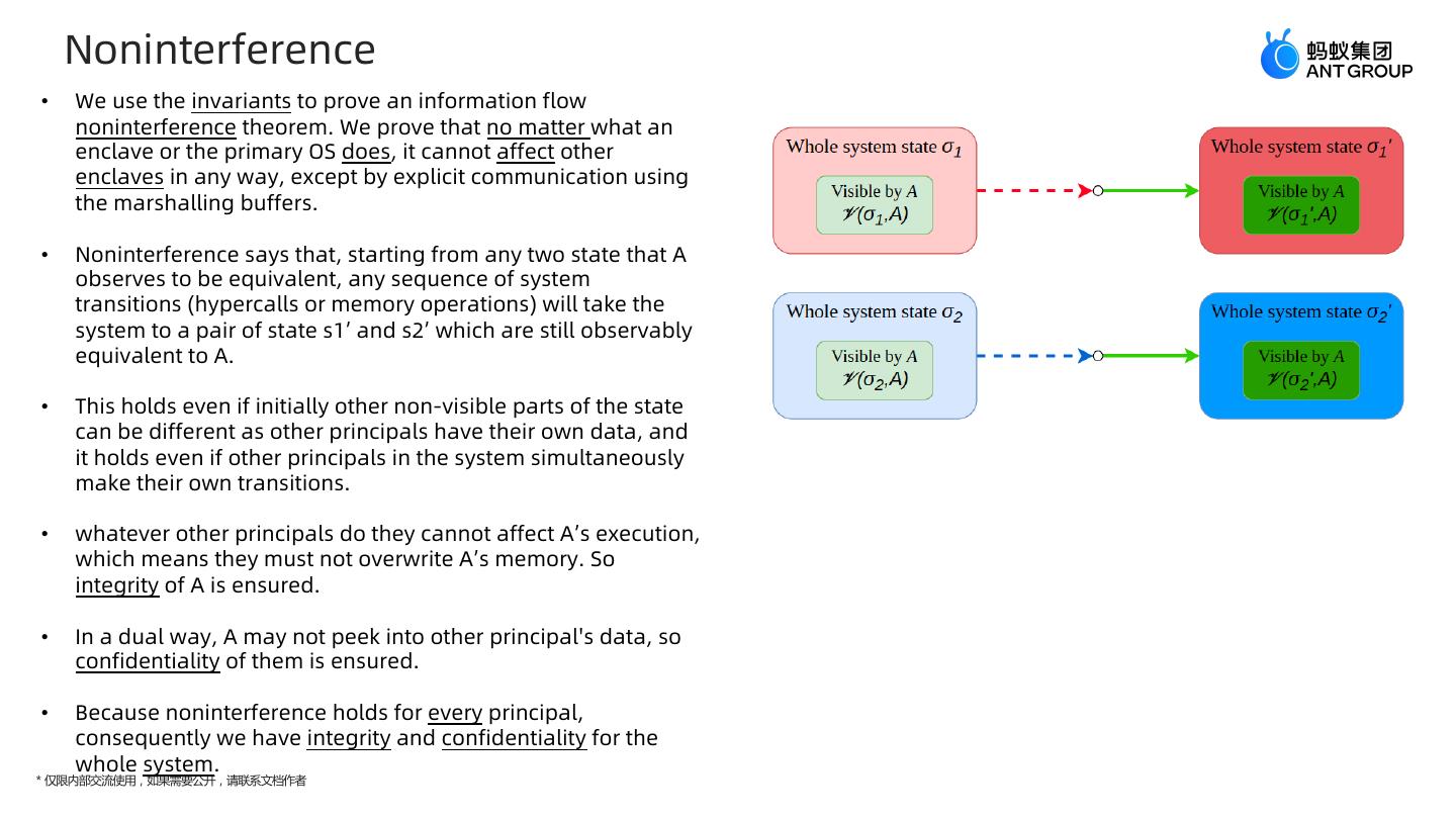 16 . Noninterference • We use the invariants to prove an information flow noninterference theorem. We prove that no matter what an enclave or the primary OS does, it cannot affect other enclaves in any way, except by explicit communication using the marshalling buffers. • Noninterference says that, starting from any two state that A observes to be equivalent, any sequence of system transitions (hypercalls or memory operations) will take the system to a pair of state s1’ and s2’ which are still observably equivalent to A. • This holds even if initially other non-visible parts of the state can be different as other principals have their own data, and it holds even if other principals in the system simultaneously make their own transitions. • whatever other principals do they cannot affect A’s execution, which means they must not overwrite A’s memory. So integrity of A is ensured. • In a dual way, A may not peek into other principal's data, so confidentiality of them is ensured. • Because noninterference holds for every principal, consequently we have integrity and confidentiality for the whole system. * 仅限内部交流使用,如果需要公开,请联系文档作者