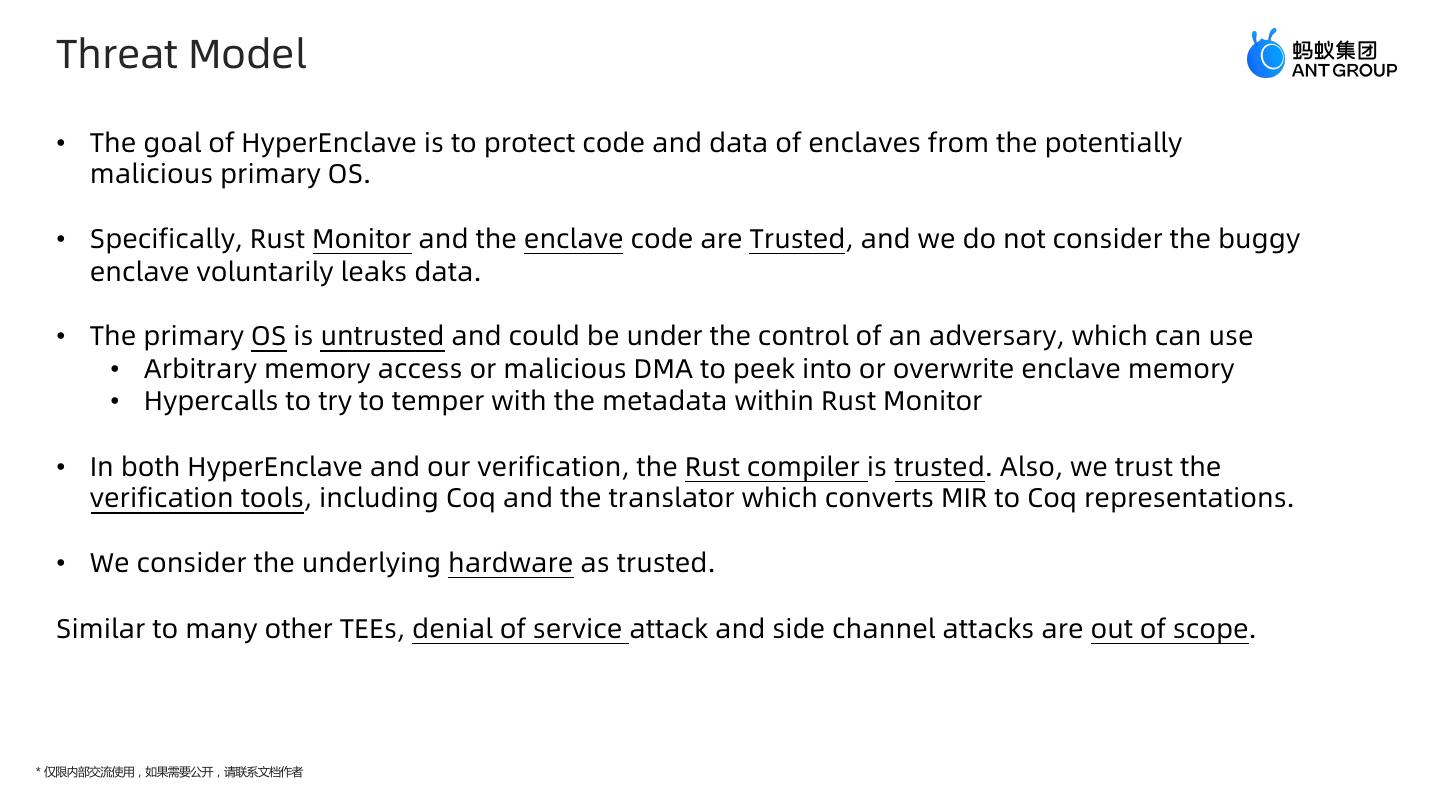 18 . Threat Model • The goal of HyperEnclave is to protect code and data of enclaves from the potentially malicious primary OS. • Specifically, Rust Monitor and the enclave code are Trusted, and we do not consider the buggy enclave voluntarily leaks data. • The primary OS is untrusted and could be under the control of an adversary, which can use • Arbitrary memory access or malicious DMA to peek into or overwrite enclave memory • Hypercalls to try to temper with the metadata within Rust Monitor • In both HyperEnclave and our verification, the Rust compiler is trusted. Also, we trust the verification tools, including Coq and the translator which converts MIR to Coq representations. • We consider the underlying hardware as trusted. Similar to many other TEEs, denial of service attack and side channel attacks are out of scope. * 仅限内部交流使用,如果需要公开,请联系文档作者