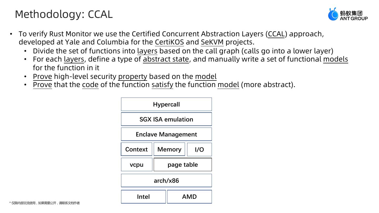 19 . Methodology: CCAL • To verify Rust Monitor we use the Certified Concurrent Abstraction Layers (CCAL) approach, developed at Yale and Columbia for the CertiKOS and SeKVM projects. • Divide the set of functions into layers based on the call graph (calls go into a lower layer) • For each layers, define a type of abstract state, and manually write a set of functional models for the function in it • Prove high-level security property based on the model • Prove that the code of the function satisfy the function model (more abstract). Hypercall SGX ISA emulation Enclave Management Context Memory I/O vcpu page table arch/x86 Intel AMD * 仅限内部交流使用,如果需要公开,请联系文档作者