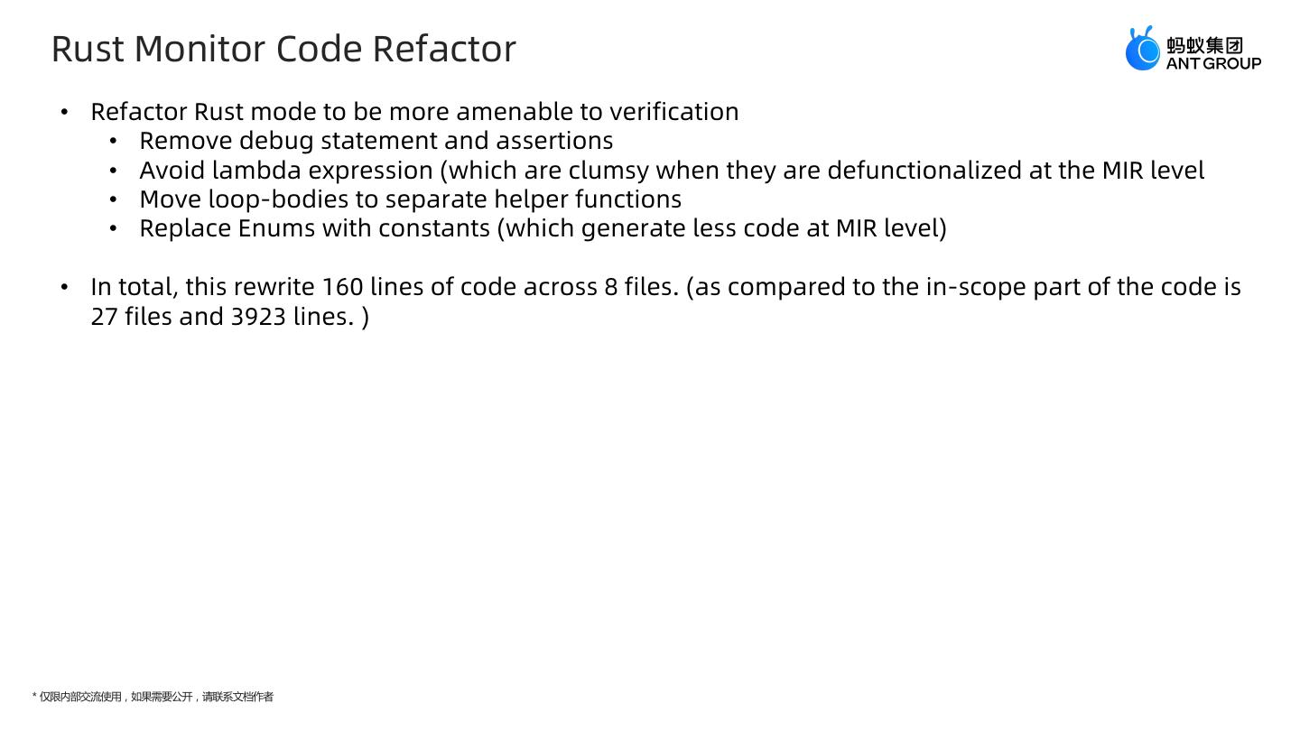 20 . Rust Monitor Code Refactor • Refactor Rust mode to be more amenable to verification • Remove debug statement and assertions • Avoid lambda expression (which are clumsy when they are defunctionalized at the MIR level • Move loop-bodies to separate helper functions • Replace Enums with constants (which generate less code at MIR level) • In total, this rewrite 160 lines of code across 8 files. (as compared to the in-scope part of the code is 27 files and 3923 lines. ) * 仅限内部交流使用,如果需要公开,请联系文档作者