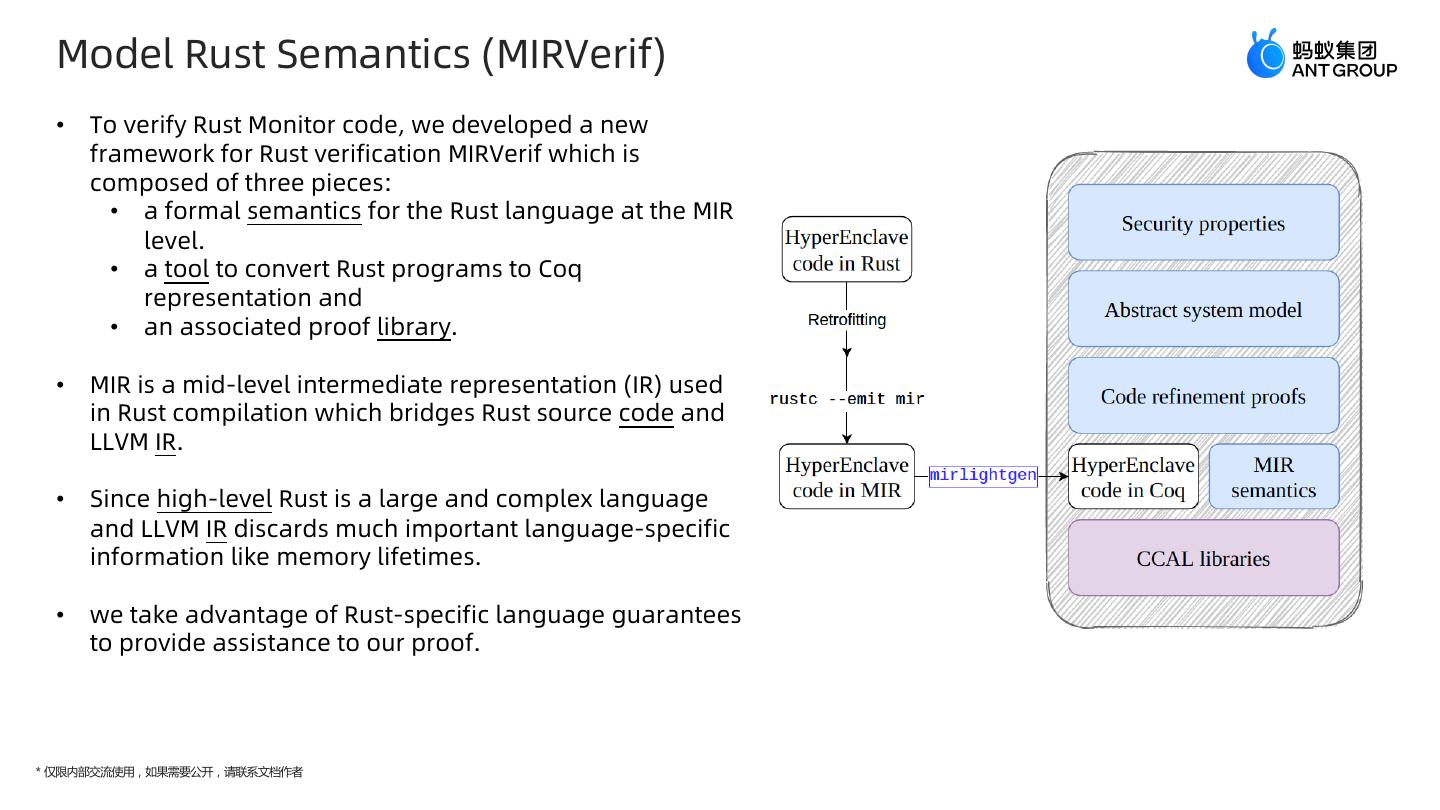 21 . Model Rust Semantics (MIRVerif) • To verify Rust Monitor code, we developed a new framework for Rust verification MIRVerif which is composed of three pieces: • a formal semantics for the Rust language at the MIR level. • a tool to convert Rust programs to Coq representation and • an associated proof library. • MIR is a mid-level intermediate representation (IR) used in Rust compilation which bridges Rust source code and LLVM IR. • Since high-level Rust is a large and complex language and LLVM IR discards much important language-specific information like memory lifetimes. • we take advantage of Rust-specific language guarantees to provide assistance to our proof. * 仅限内部交流使用,如果需要公开,请联系文档作者
