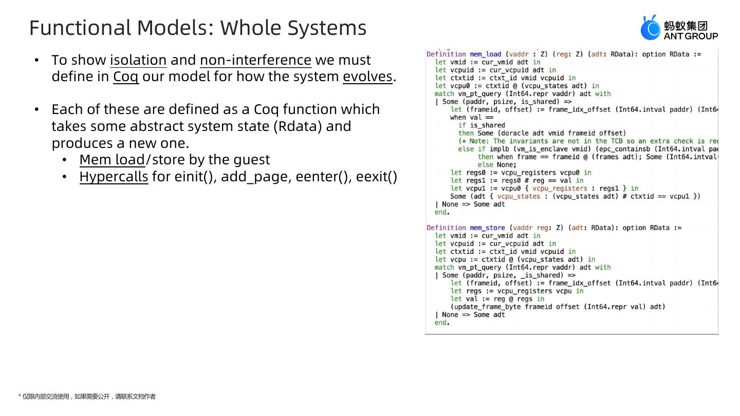 22 . Functional Models: Whole Systems • To show isolation and non-interference we must define in Coq our model for how the system evolves. • Each of these are defined as a Coq function which takes some abstract system state (Rdata) and produces a new one. • Mem load/store by the guest • Hypercalls for einit(), add_page, eenter(), eexit() * 仅限内部交流使用,如果需要公开,请联系文档作者