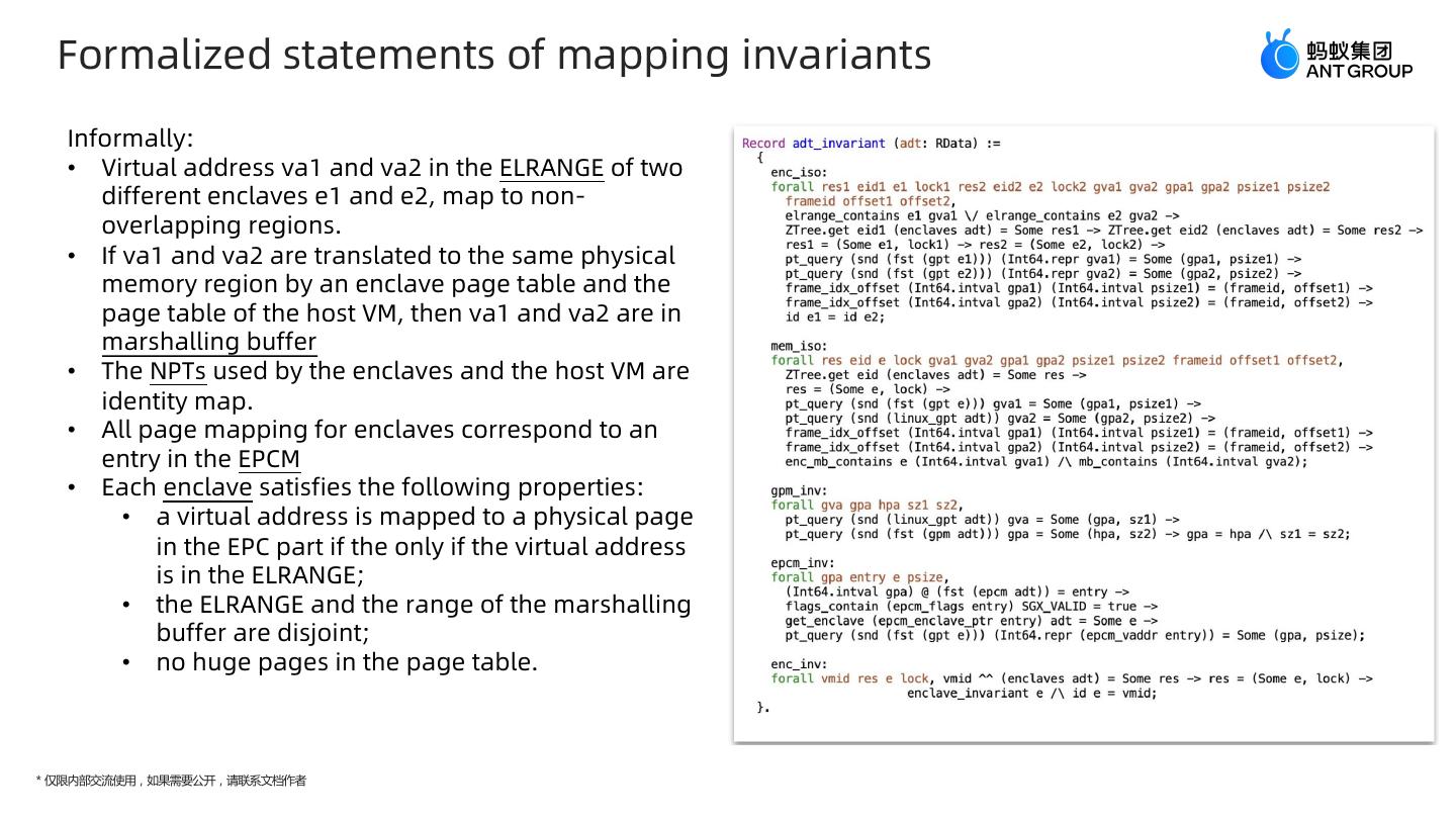 23 . Formalized statements of mapping invariants Informally: • Virtual address va1 and va2 in the ELRANGE of two different enclaves e1 and e2, map to non- overlapping regions. • If va1 and va2 are translated to the same physical memory region by an enclave page table and the page table of the host VM, then va1 and va2 are in marshalling buffer • The NPTs used by the enclaves and the host VM are identity map. • All page mapping for enclaves correspond to an entry in the EPCM • Each enclave satisfies the following properties: • a virtual address is mapped to a physical page in the EPC part if the only if the virtual address is in the ELRANGE; • the ELRANGE and the range of the marshalling buffer are disjoint; • no huge pages in the page table. * 仅限内部交流使用,如果需要公开,请联系文档作者