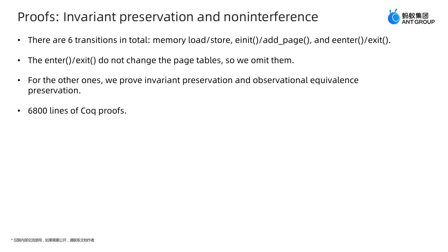 25 . Proofs: Invariant preservation and noninterference • There are 6 transitions in total: memory load/store, einit()/add_page(), and eenter()/exit(). • The enter()/exit() do not change the page tables, so we omit them. • For the other ones, we prove invariant preservation and observational equivalence preservation. • 6800 lines of Coq proofs. * 仅限内部交流使用,如果需要公开,请联系文档作者