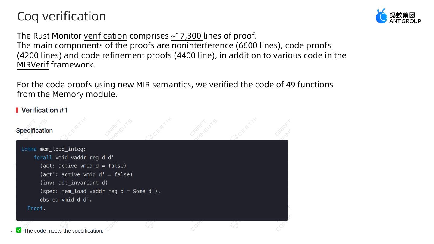 26 . Coq verification The Rust Monitor verification comprises ~17,300 lines of proof. The main components of the proofs are noninterference (6600 lines), code proofs (4200 lines) and code refinement proofs (4400 line), in addition to various code in the MIRVerif framework. For the code proofs using new MIR semantics, we verified the code of 49 functions from the Memory module. * 仅限内部交流使用,如果需要公开,请联系文档作者