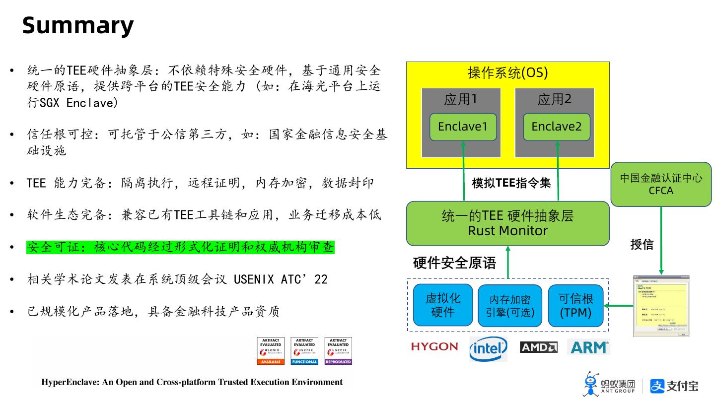 29 . Summary • !"#$%%&'()*+,-./012&'3456712 操作系统(OS) &'893:;<=>#$%%12?@ AB+CDE=>FG HIJK %LMNOPQR 应用1 应用2 Enclave1 Enclave2 • STUVW+VXY5ZS[\]3B+^_`aSb124 cde 中国金融认证中心 • $%% ?@fg+hijH3klmn3opqr3stuv 模拟TEE指令集 CFCA • w'xyfg+z{|}$%%~•€•‚73ƒ„…†‡ˆ‰ 统一的TEE 硬件抽象层 RustTEE安全功能实现 Monitor • 12Vm+Š‹Œ•Ž••‘’mn•“”•–—˜ 授信 硬件安全原语 • ™š›œ•žŸ C¡!¢£¤¥ ¦I%§¨K ©$ª«¬¬ 虚拟化 内存加密 可信根 • |-®’¯°±²3•g`a³´¯°µ¶ 硬件 引擎(可选) (TPM)