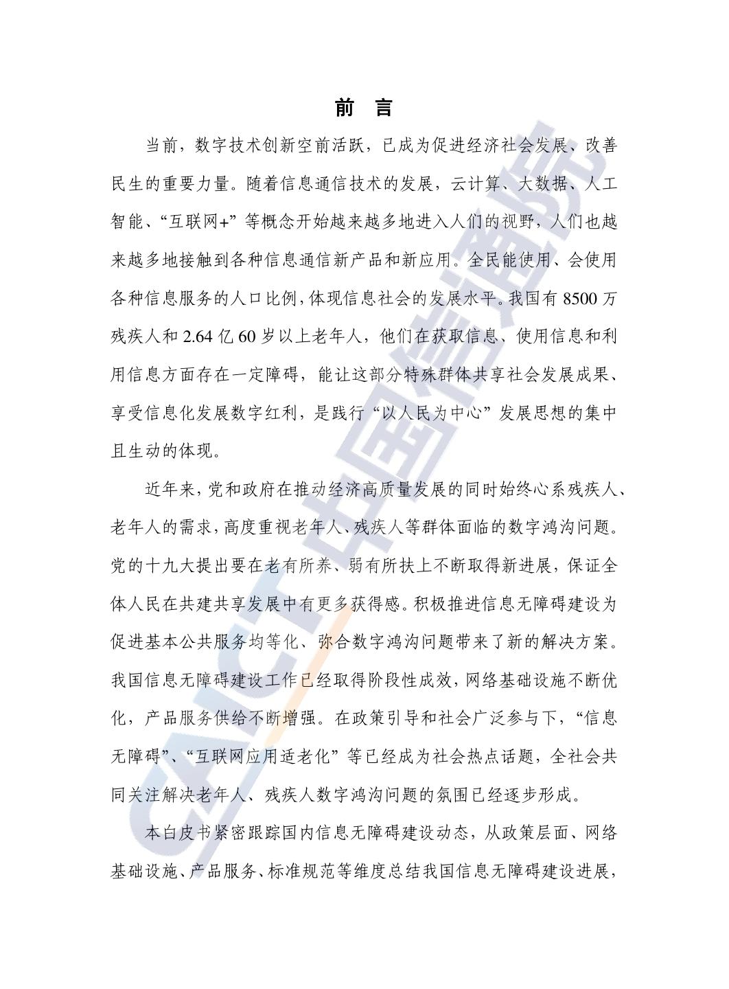 4 . 前 言 当前,数字技术创新空前活跃,已成为促进经济社会发展、改善 民生的重要力量。随着信息通信技术的发展,云计算、大数据、人工 智能、 “互联网+”等概念开始越来越多地进入人们的视野,人们也越 来越多地接触到各种信息通信新产品和新应用。全民能使用、会使用 各种信息服务的人口比例,体现信息社会的发展水平。我国有 8500 万 残疾人和 2.64 亿 60 岁以上老年人,他们在获取信息、使用信息和利 用信息方面存在一定障碍,能让这部分特殊群体共享社会发展成果、 享受信息化发展数字红利,是践行“以人民为中心”发展思想的集中 且生动的体现。 近年来,党和政府在推动经济高质量发展的同时始终心系残疾人、 老年人的需求,高度重视老年人、残疾人等群体面临的数字鸿沟问题。 党的十九大提出要在老有所养、弱有所扶上不断取得新进展,保证全 体人民在共建共享发展中有更多获得感。积极推进信息无障碍建设为 促进基本公共服务均等化、弥合数字鸿沟问题带来了新的解决方案。 我国信息无障碍建设工作已经取得阶段性成效,网络基础设施不断优 化,产品服务供给不断增强。在政策引导和社会广泛参与下, “信息 无障碍”、 “互联网应用适老化”等已经成为社会热点话题,全社会共 同关注解决老年人、残疾人数字鸿沟问题的氛围已经逐步形成。 本白皮书紧密跟踪国内信息无障碍建设动态,从政策层面、网络 基础设施、产品服务、标准规范等维度总结我国信息无障碍建设进展,