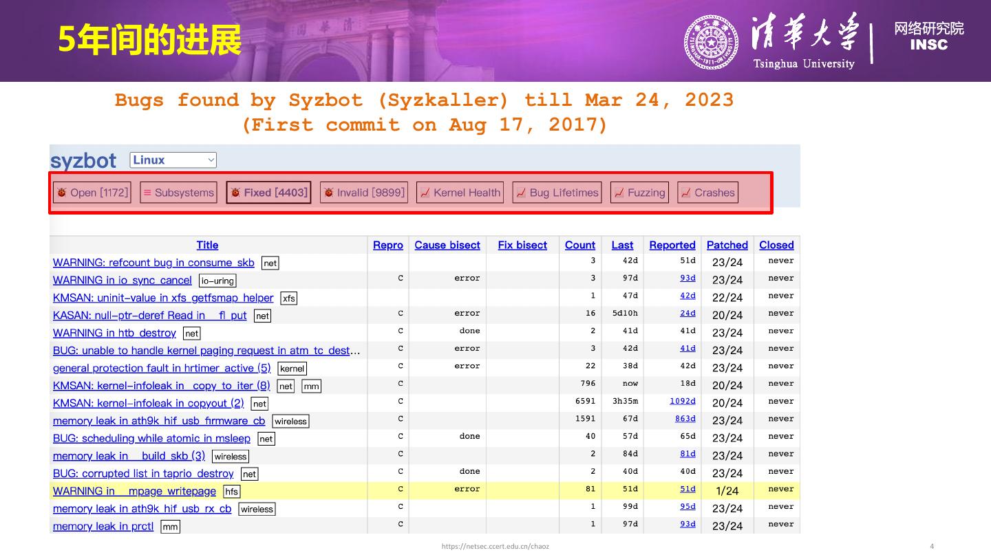 4 .5年间的进展 网络研究院 INSC Bugs found by Syzbot (Syzkaller) till Mar 24, 2023 (First commit on Aug 17, 2017) https://netsec.ccert.edu.cn/chaoz 4