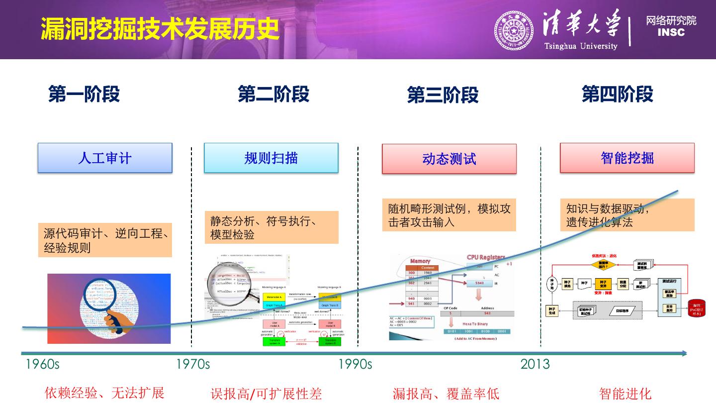 6 . 漏洞挖掘技术发展历史 网络研究院 INSC 第一阶段 第二阶段 第三阶段 第四阶段 人工审计 规则扫描 动态测试 智能挖掘 随机畸形测试例,模拟攻 知识与数据驱动, 静态分析、符号执行、 击者攻击输入 遗传进化算法 源代码审计、逆向工程、 模型检验 经验规则 1960s 1970s 1990s 2013 依赖经验、无法扩展 误报高/可扩展性差 漏报高、覆盖率低 智能进化