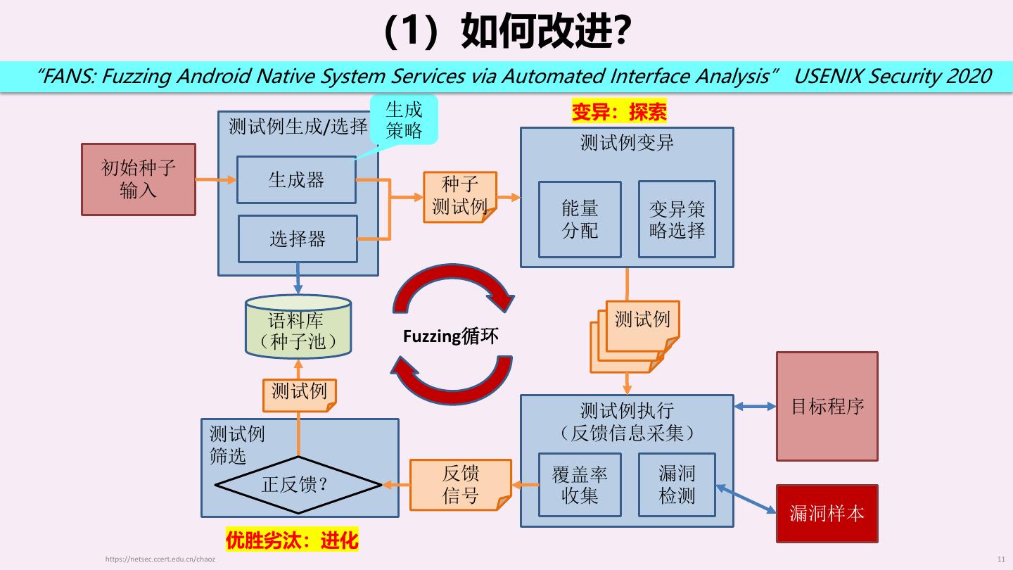 11 . (1)如何改进? “FANS: Fuzzing Android Native System Services via Automated Interface Analysis” USENIX Security 2020 生成 变异:探索 测试例生成/选择 策略 测试例变异 初始种子 生成器 种子 输入 测试例 能量 变异策 选择器 分配 略选择 语料库 测试例 测试例 (种子池) Fuzzing循环 测试例 测试例 测试例执行 目标程序 测试例 (反馈信息采集) 筛选 反馈 覆盖率 漏洞 正反馈? 信号 收集 检测 漏洞样本 优胜劣汰:进化 https://netsec.ccert.edu.cn/chaoz 11