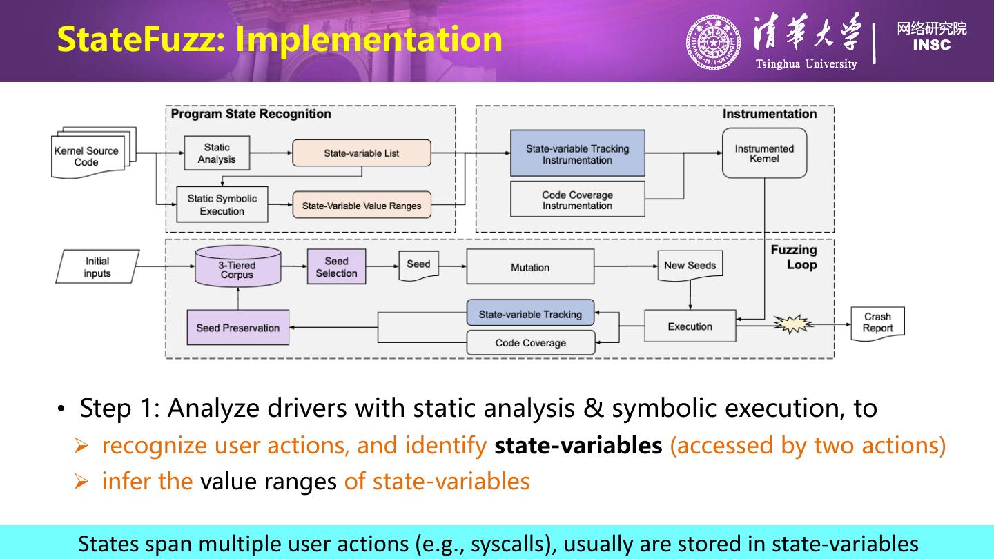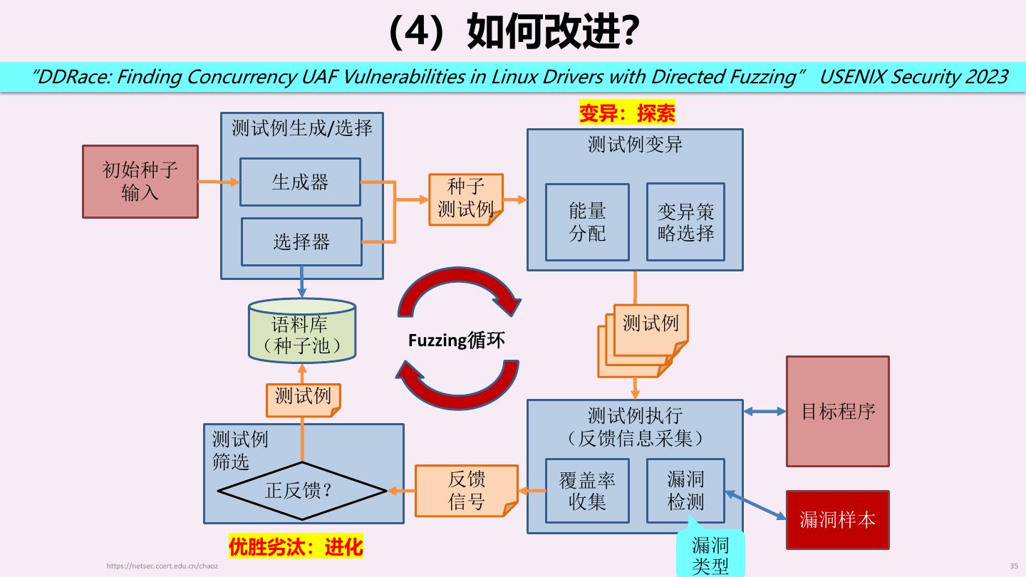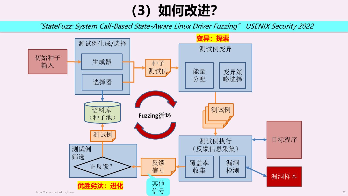 27 . (3)如何改进? “StateFuzz: System Call-Based State-Aware Linux Driver Fuzzing” USENIX Security 2022 变异:探索 测试例生成/选择 测试例变异 初始种子 生成器 种子 输入 测试例 能量 变异策 选择器 分配 略选择 语料库 测试例 测试例 (种子池) Fuzzing循环 测试例 测试例 测试例执行 目标程序 测试例 (反馈信息采集) 筛选 反馈 覆盖率 漏洞 正反馈? 信号 收集 检测 漏洞样本 优胜劣汰:进化 其他 https://netsec.ccert.edu.cn/chaoz 信号 27