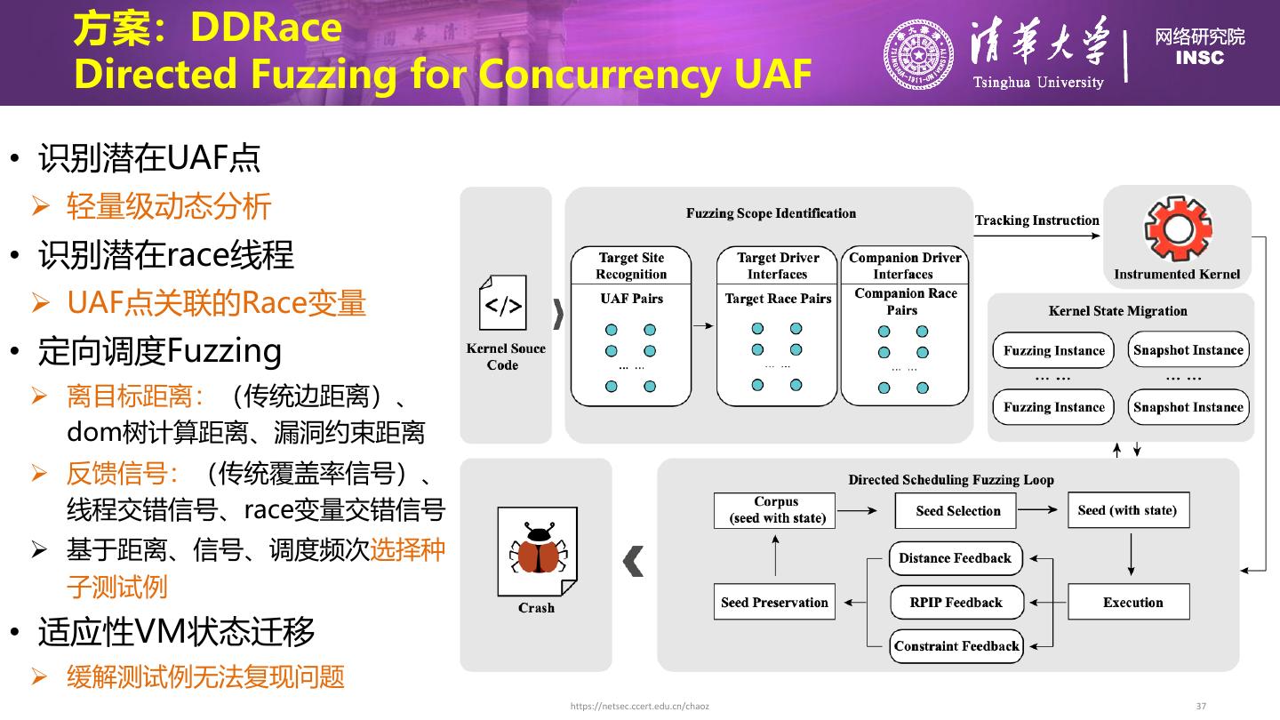 10 .代表性kernel fuzzing方案:Syzkaller 网络研究院 INSC • Fuzzer与kernel ➢ Fuzzer:guest vm用户态 ➢ Kernel:guest vm内核 • 测试例变异 ➢ Syzlang描述syscall格式 • 覆盖率采集 ➢ kcov(源码编译插桩) • 漏洞检测 ➢ KASAN(源码编译插桩) ➢ KTSan, KMSan, KUBSan • 其他特性 ➢ 远程管理, web展示, 并行化 https://netsec.ccert.edu.cn/chaoz 10