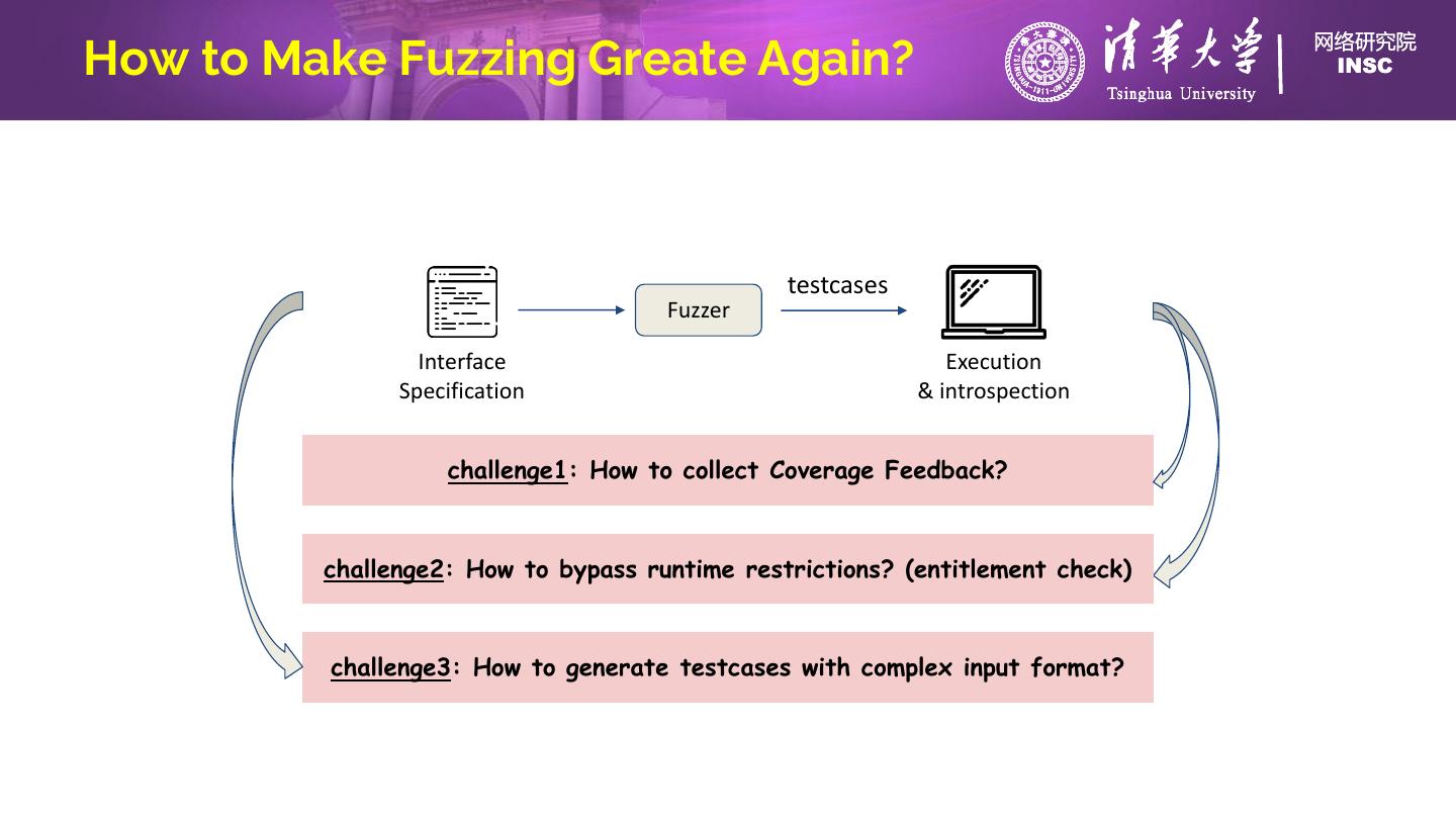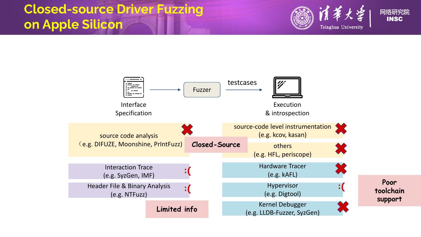 21 . Problem: 网络研究院 INSC Drivers are unreliable and underexplored • Distribution of bugs in the android kernel[1] • The distribution of code in drivers[2] • 驱动程序代码量大、漏洞多; [1] https://events.static.linuxfound.org/sites/events/files/slides/Android-%20protecting%20the%20kernel.pdf [2] Asim Kadav and Michael M Swift. 2012. Understanding modern device drivers. ACM SIGPLAN Notices 47, 4 (2012), 87–98. • 但是,fuzzing难以测试驱动代码,因为驱动代码依赖于外设,实际测试环境缺少大量的硬件外设