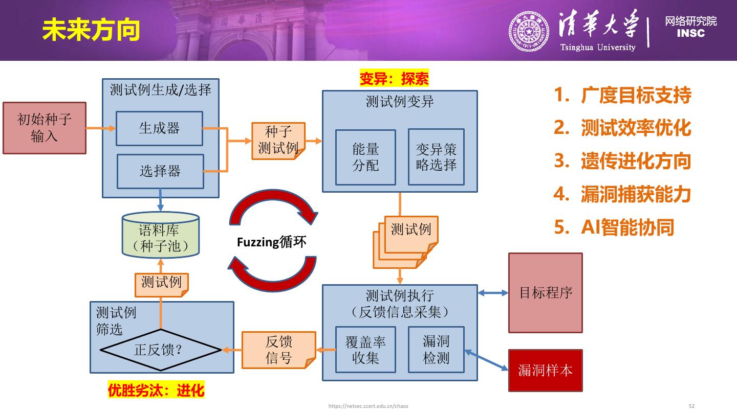 8 .智能模糊测试(fuzzing) 网络研究院 INSC 变异:探索 测试例生成/选择 测试例变异 初始种子 生成器 种子 输入 测试例 能量 变异策 选择器 分配 略选择 语料库 测试例 测试例 (种子池) Fuzzing循环 测试例 测试例 测试例执行 目标程序 测试例 (反馈信息采集) 筛选 反馈 覆盖率 漏洞 正反馈? 信号 收集 检测 漏洞样本 优胜劣汰:进化 https://netsec.ccert.edu.cn/chaoz 8