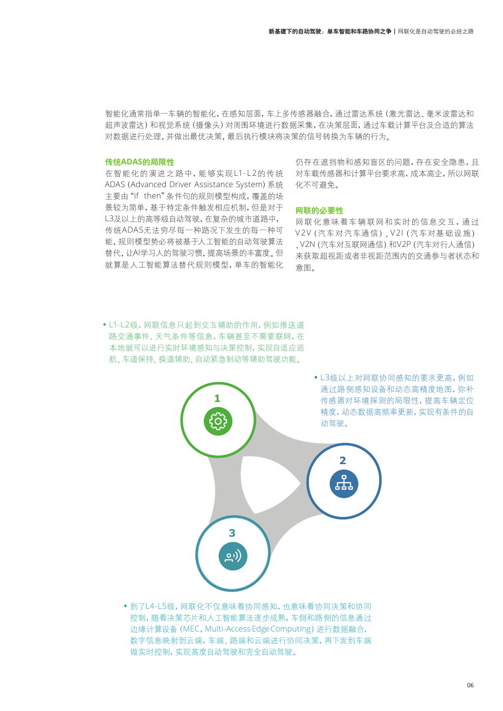 7 . 新基建下的自动驾驶:单车智能和车路协同之争 | 网联化是自动驾驶的必经之路 智能化通常指单一车辆的智能化,在感知层面,车上多传感器融合,通过雷达系统(激光雷达、毫米波雷达和 超声波雷达)和视觉系统(摄像头)对周围环境进行数据采集,在决策层面,通过车载计算平台及合适的算法 对数据进行处理,并做出最优决策,最后执行模块将决策的信号转换为车辆的行为。 传统ADAS的局限性 仍存在遮挡物和感知盲区的问题,存在安全隐患,且 在智能化 的演 进 之 路中,能够实现 L1- L 2的 传 统 对车载传感器和计算平台要求高,成本高企,所以网联 ADAS(Advanced Driver Assistance System)系统 化不可避免。 主要由“if then”条件句的规则模型构成,覆盖的场 景较为简单,基于特定条件触发相应机制,但是对于 网联的必要性 L3及以上的高等级自动驾驶,在复杂的城市道路中, 网 联 化 意 味着车 辆 联 网 和 实时 的 信 息 交 互,通 过 传统ADAS无法穷尽每一种路况下发生的每一种可 V 2 V(汽车对 汽车通信)、V 2I( 汽车对基 础设 施) 能,规则模型势必将被基于人工智能的自动驾驶算法 、V2N(汽车对互联网通信)和V2P(汽车对行人通信) 替代,让AI学习人的驾驶习惯,提高场景的丰富度。但 来获取超视距或者非视距范围内的交通参与者状态和 就算是人工智能算法替代规则模型,单车的智能化 意图。 • L1-L2级,网联信息只起到交互辅助的作用,例如推送道 路交通事件、天气条件等信息,车辆甚至不需要联网,在 本地就可以进行实时环境感知与决策控制,实现自适应巡 航、车道保持、换道辅助、自动紧急制动等辅助驾驶功能。 • L3级以上对网联协同感知的要求更高,例如 通过路侧感知设备和动态高精度地图,弥补 1 传感器对环境探测的局限性,提高车辆定位 精度,动态数据高频率更新,实现有条件的自 动驾驶。 Lorem ipsum 2 Lorem ipsum 3 Lorem ipsum • 到了L4-L5级,网联化不仅意味着协同感知,也意味着协同决策和协同 控制,随着决策芯片和人工智能算法逐步成熟,车侧和路侧的信息通过 边缘计算设备(MEC,Multi-Access Edge Computing)进行数据融合, 数字信息映射到云端,车端、路端和云端进行协同决策,再下发到车端 做实时控制,实现高度自动驾驶和完全自动驾驶。 06