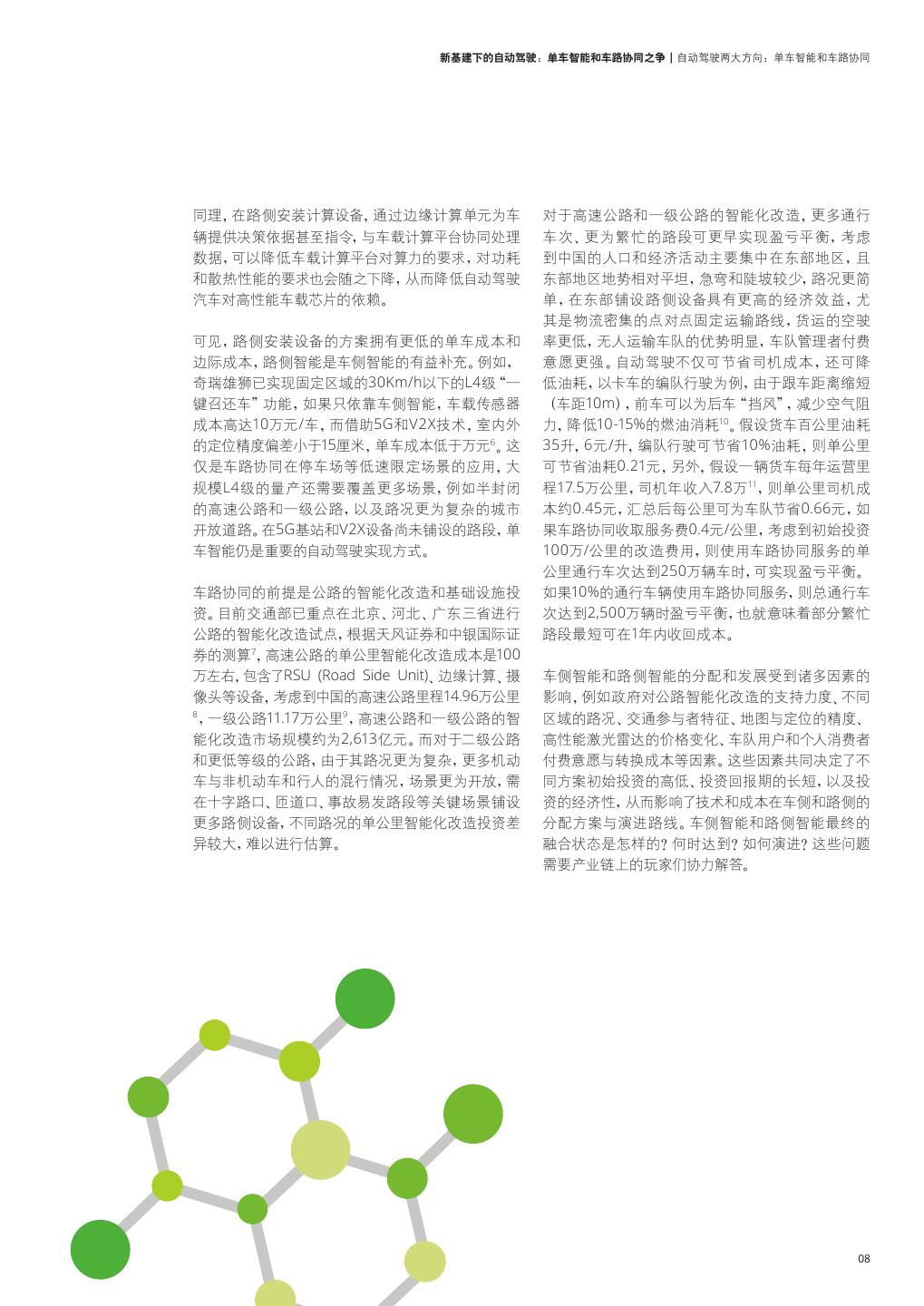 9 . 新基建下的自动驾驶:单车智能和车路协同之争 | 自动驾驶两大方向:单车智能和车路协同 同理,在路侧安装计算设备,通过边缘计算单元为车 对于高速公路和一级公路的智能化改造,更多通行 辆提供决策依据甚至指令,与车载计算平台协同处理 车次、更为繁忙的路段可更早实现盈亏平衡,考虑 数据,可以降低车载计算平台对算力的要求,对功耗 到中国的人口和经济活动主要集中在东部地区,且 和散热性能的要求也会随之下降,从而降低自动驾驶 东部地区地势相对平坦,急弯和陡坡较少,路况更简 汽车对高性能车载芯片的依赖。 单,在东部铺设路侧设备具有更高的经济效益,尤 其是物流密集的点对点固定运输路线,货运的空驶 可见,路侧安装设备的方案拥有更低的单车成本和 率更低,无人运输车队的优势明显,车队管理者付费 边际成本,路侧智能是车侧智能的有益补充。例如, 意愿更强。自动驾驶不仅可节省司机成本,还可降 奇瑞雄狮已实现固定区域的30Km/h以下的L4级“一 低油耗,以卡车的编队行驶为例,由于跟车距离缩短 键召还车”功能,如果只依靠车侧智能,车载传感器 (车距10m),前车可以为后车“挡风”,减少空气阻 成本高达10万元/车,而借助5G和V2X技术,室内外 力,降低10-15%的燃油消耗10。假设货车百公里油耗 的定位精度偏差小于15厘米,单车成本低于万元6。这 35升,6元/升,编队行驶可节省10%油耗,则单公里 仅是车路协同在停车场等低速限定场景的应用,大 可节省油耗0.21元,另外,假设一辆货车每年运营里 规模L4级的量产还需要覆盖更多场景,例如半封闭 程17.5万公里,司机年收入7.8万11,则单公里司机成 的高速公路和一级公路,以及路况更为复杂的城市 本约0.45元,汇总后每公里可为车队节省0.66元,如 开放道路。在5G基站和V2X设备尚未铺设的路段,单 果车路协同收取服务费0.4元/公里,考虑到初始投资 车智能仍是重要的自动驾驶实现方式。 100万/公里的改造费用,则使用车路协同服务的单 公里通行车次达到250万辆车时,可实现盈亏平衡。 车路协同的前提是公路的智能化改造和基础设施投 如果10%的通行车辆使用车路协同服务,则总通行车 资。目前交通部已重点在北京、河北、广东三省进行 次达到2,500万辆时盈亏平衡,也就意味着部分繁忙 公路的智能化改造试点,根据天风证券和中银国际证 路段最短可在1年内收回成本。 券的测算7,高速公路的单公里智能化改造成本是100 万左右,包含了RSU (Road Side Unit)、边缘计算、摄 车侧智能和路侧智能的分配和发展受到诸多因素的 像头等设备,考虑到中国的高速公路里程14.96万公里 影响,例如政府对公路智能化改造的支持力度、不同 8 ,一级公路11.17万公里9,高速公路和一级公路的智 区域的路况、交通参与者特征、地图与定位的精度、 能化改造市场规模约为2,613亿元。而对于二级公路 高性能激光雷达的价格变化、车队用户和个人消费者 和更低等级的公路,由于其路况更为复杂,更多机动 付费意愿与转换成本等因素。这些因素共同决定了不 车与非机动车和行人的混行情况,场景更为开放,需 同方案初始投资的高低、投资回报期的长短,以及投 在十字路口、匝道口、事故易发路段等关键场景铺设 资的经济性,从而影响了技术和成本在车侧和路侧的 更多路侧设备,不同路况的单公里智能化改造投资差 分配方案与演进路线。车侧智能和路侧智能最终的 异较大,难以进行估算。 融合状态是怎样的?何时达到?如何演进?这些问题 需要产业链上的玩家们协力解答。 08