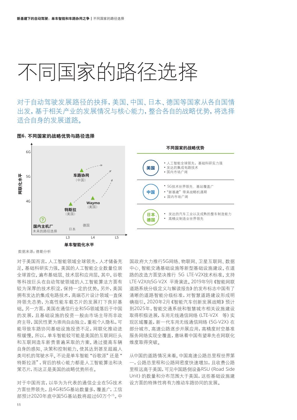 12 .新基建下的自动驾驶:单车智能和车路协同之争 | 不同国家的路径选择 不同国家的路径选择 对于自动驾驶发展路径的抉择,美国、中国、日本、德国等国家从各自国情 出发,基于相关产业的发展情况与核心能力,整合各自的战略优势,将选择 适合自身的发展道路。 图6:不同国家的战略优势与路径选择 不同国家的战略优势 6G • 人工智能全球领先,基础科研实力强 美国 • 发达的集成电路技术 • 国内市场广阔 车路协同 网联化水平 5G (中国) • 5G技术世界领先,基站覆盖广 中国 •“新基建”带来战略机遇期 • 国内市场广阔 4G Waymo (美国) 特斯拉 (美国) 日本、 • 发达的汽车工业以及成熟的整车制造能力 德国 • 高精尖制造业世界领先 国内主机厂 德国 日本 未来的路径选择 L3 L4 L5 单车智能化水平 数据来源:德勤分析 对于美国而言,人工智能领域全球领先,人才储备充 国政府大力推行5G网络、物联网、卫星互联网、数据 足,基础科研实力强,美国的人工智能企业数量位居 中心、智能交通基础设施等新型基础设施建设,在道 全球首位,遍布基础层、技术层和应用层,其中,谷歌 路的改造方面坚决推行 5G LTE-V2X技术标准,支持 等科技巨头在自动驾驶领域的人工智能算法方面有 LTE-V2X向5G-V2X 平滑演进。2019年9月《智能网联 较为深厚的技术积淀,保持一定的优势。另外,美国 道路系统分级定义与解读报告》的发布标志中国有了 拥有发达的集成电路技术,高端芯片设计领域一直保 清晰的道路智能分级标准,对智慧道路建设形成明 持领先态势,为高性能车载芯片的发展打下良好基 确指引。2020年2月《智能汽车创新发展战略》预计 础。另一方面,美国在通信行业和5G领域落后于中国 到2025年,智能交通系统和智慧城市相关设施建设 的发展,且基础设施的投资一般由市场主导而非政 取得积极进展,车用无线通信网络(LTE-V2X 等)实 府主导,国民性更为崇尚自由独立,重视个人隐私,可 现区域覆盖,新一代车用无线通信网络(5G-V2X)在 能导致车路协同基础设施投资不足,网联化推动进 部分城市、高速公路逐步开展应用,高精度时空基准 程缓慢。所以,单车智能较可能是美国的互联网巨头 服务网络实现全覆盖,意味着中国有望率先在网联化 和互联网造车新贵普遍采取的方案,通过提高车辆 维度取得突破。 自身的感知、决策和控制能力,使其达到甚至超越人 类司机的驾驶水平。不论是单车智能“谷歌派”还是“ 从中国的道路情况来看,中国高速公路总里程世界第 特斯拉派”,背后的核心能力都是人工智能算法和决 一,公路总里程和公路网密度快速增加,且收费公路 策芯片,而这正是美国的战略优势所在。 里程远高于美国,可见中国路侧设备RSU(Road Side Unit)的数量和分布范围大于美国,这些基础设施建 对于中国而言,以华为为代表的通信企业在5G技术 设方面的特殊性将有力推动车路协同的发展。 方面世界领先,且4G和5G基站数量多,覆盖广,工信 部预计2020年底中国5G基站数将超过60万个15。中 11