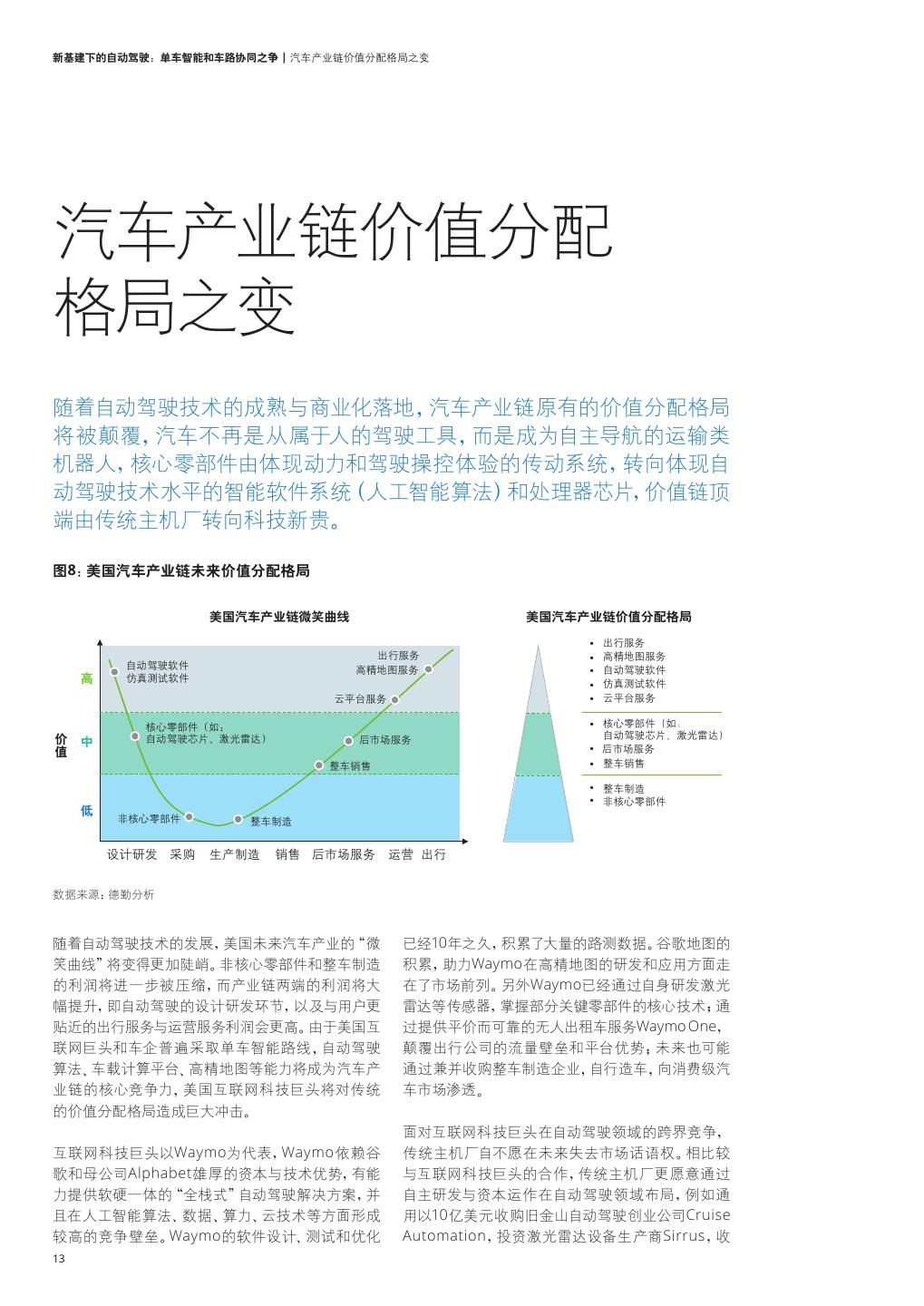 14 .新基建下的自动驾驶:单车智能和车路协同之争 | 汽车产业链价值分配格局之变 汽车产业链价值分配 格局之变 随着自动驾驶技术的成熟与商业化落地,汽车产业链原有的价值分配格局 将被颠覆,汽车不再是从属于人的驾驶工具,而是成为自主导航的运输类 机器人,核心零部件由体现动力和驾驶操控体验的传动系统,转向体现自 动驾驶技术水平的智能软件系统(人工智能算法)和处理器芯片,价值链顶 端由传统主机厂转向科技新贵。 图8:美国汽车产业链未来价值分配格局 美国汽车产业链微笑曲线 美国汽车产业链价值分配格局 • 出行服务 出行服务 • 高精地图服务 自动驾驶软件 高精地图服务 • 自动驾驶软件 高 仿真测试软件 • 仿真测试软件 云平台服务 • 云平台服务 • 核心零部件(如: 价值 核心零部件(如: 自动驾驶芯片、激光雷达) 后市场服务 自动驾驶芯片、激光雷达) 中 • 后市场服务 整车销售 • 整车销售 • 整车制造 • 非核心零部件 低 非核心零部件 整车制造 设计研发 采购 生产制造 销售 后市场服务 运营 出行 数据来源:德勤分析 随着自动驾驶技术的发展,美国未来汽车产业的“微 已经10年之久,积累了大量的路测数据。谷歌地图的 笑曲线”将变得更加陡峭。非核心零部件和整车制造 积累,助力Waymo在高精地图的研发和应用方面走 的利润将进一步被压缩,而产业链两端的利润将大 在了市场前列。另外Waymo已经通过自身研发激光 幅提升,即自动驾驶的设计研发环节,以及与用户更 雷达等传感器,掌握部分关键零部件的核心技术;通 贴近的出行服务与运营服务利润会更高。由于美国互 过提供平价而可靠的无人出租车服务Waymo One, 联网巨头和车企普遍采取单车智能路线,自动驾驶 颠覆出行公司的流量壁垒和平台优势;未来也可能 算法、车载计算平台、高精地图等能力将成为汽车产 通过兼并收购整车制造企业,自行造车,向消费级汽 业链的核心竞争力,美国互联网科技巨头将对传统 车市场渗透。 的价值分配格局造成巨大冲击。 面对互联网科技巨头在自动驾驶领域的跨界竞争, 互联网科技巨头以Waymo为代表,Waymo依赖谷 传统主机厂自不愿在未来失去市场话语权。相比较 歌和母公司Alphabet雄厚的资本与技术优势,有能 与互联网科技巨头的合作,传统主机厂更愿意通过 力提供软硬一体的“全栈式”自动驾驶解决方案,并 自主研发与资本运作在自动驾驶领域布局,例如通 且在人工智能算法、数据、算力、云技术等方面形成 用以10亿美元收购旧金山自动驾驶创业公司Cruise 较高的竞争壁垒。Waymo的软件设计、测试和优化 Automation,投资激光雷达设备生产商Sirrus,收 13