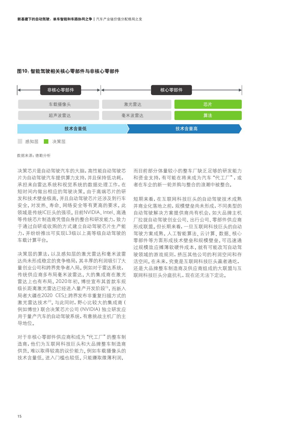 16 .新基建下的自动驾驶:单车智能和车路协同之争 | 汽车产业链价值分配格局之变 图10:智能驾驶相关核心零部件与非核心零部件 非核心零部件 核心零部件 车载摄像头 激光雷达 芯片 超声波雷达 毫米波雷达 算法 技术含量低 技术含量高 感知层 决策层 数据来源:德勤分析 决策芯片是自动驾驶汽车的大脑,高性能自动驾驶芯 而目前部分体量较小的整车厂缺乏足够的研发能力 片为自动驾驶汽车提供算力支持,并且保持低功耗, 和资金支持,有可能在将来成为汽车“代工厂”,或 承担来自雷达系统和视觉系统的数据处理工作,在 者在车企的新一轮并购与整合的浪潮中被整合。 短时间内做出相应的驾驶决策。由于高端芯片的研 发和技术壁垒极高,并且自动驾驶芯片还涉及到行车 短期来看,在互联网科技巨头的自动驾驶技术成熟 安全,对发热、寿命、网络安全等有更高的要求,此 并商业化落地之前,规模壁垒尚未形成,不同类型的 领域是传统IC巨头的强项。目前NVIDIA、Intel、高通 自动驾驶解决方案提供商尚有机会,如大品牌主机 等传统芯片制造商凭借自身的整合和研发能力,致力 厂拉拢自动驾驶创业公司、出行公司、零部件供应商 于通过自研或收购的方式建立自动驾驶芯片生产能 形成联盟。但长期来看,一旦互联网科技巨头的自动 力,并纷纷推出可实现L3级以上高等级自动驾驶的 驾驶方案成熟,人工智能算法、云计算、数据、核心 车载计算平台。 零部件等方面形成技术壁垒和规模壁垒,可迅速通 过规模效应摊薄软硬件成本,就有可能改写自动驾 决策层的算法,以及感知层的激光雷达和毫米波雷 驶领域的游戏规则,挤压其他公司的利润空间和存 达尚未形成稳定的竞争格局,其丰厚的利润吸引了大 活空间。在未来,究竟是互联网科技巨头赢者通吃, 量创业公司和跨界竞争者入局。例如对于雷达系统, 还是大品牌整车制造商及供应商组成的大联盟与互 传统供应商多布局毫米波雷达,大的集成商在激光 联网科技巨头分庭抗礼,现在还无法下定论。 雷达上也有布局,2020年初,博世宣布其首款车规 级长距离激光雷达已经进入量产开发阶段19,而新入 局者大疆在2020 CES上跨界发布非重复扫描方式的 激光雷达技术 20。与此同时,野心比较大的集成商( 例如博世)联合决策芯片公司(NVIDIA)独立研发应 用于量产汽车的自动驾驶系统,有意挑战主机厂的主 导地位。 对于非核心零部件供应商和成为“代工厂”的整车制 造商,他们为互联网科技巨头和大品牌整车制造商 供货,难以取得较高的议价能力。例如车载摄像头的 技术含量低,进入门槛也较低,只能赚取微薄利润, 15