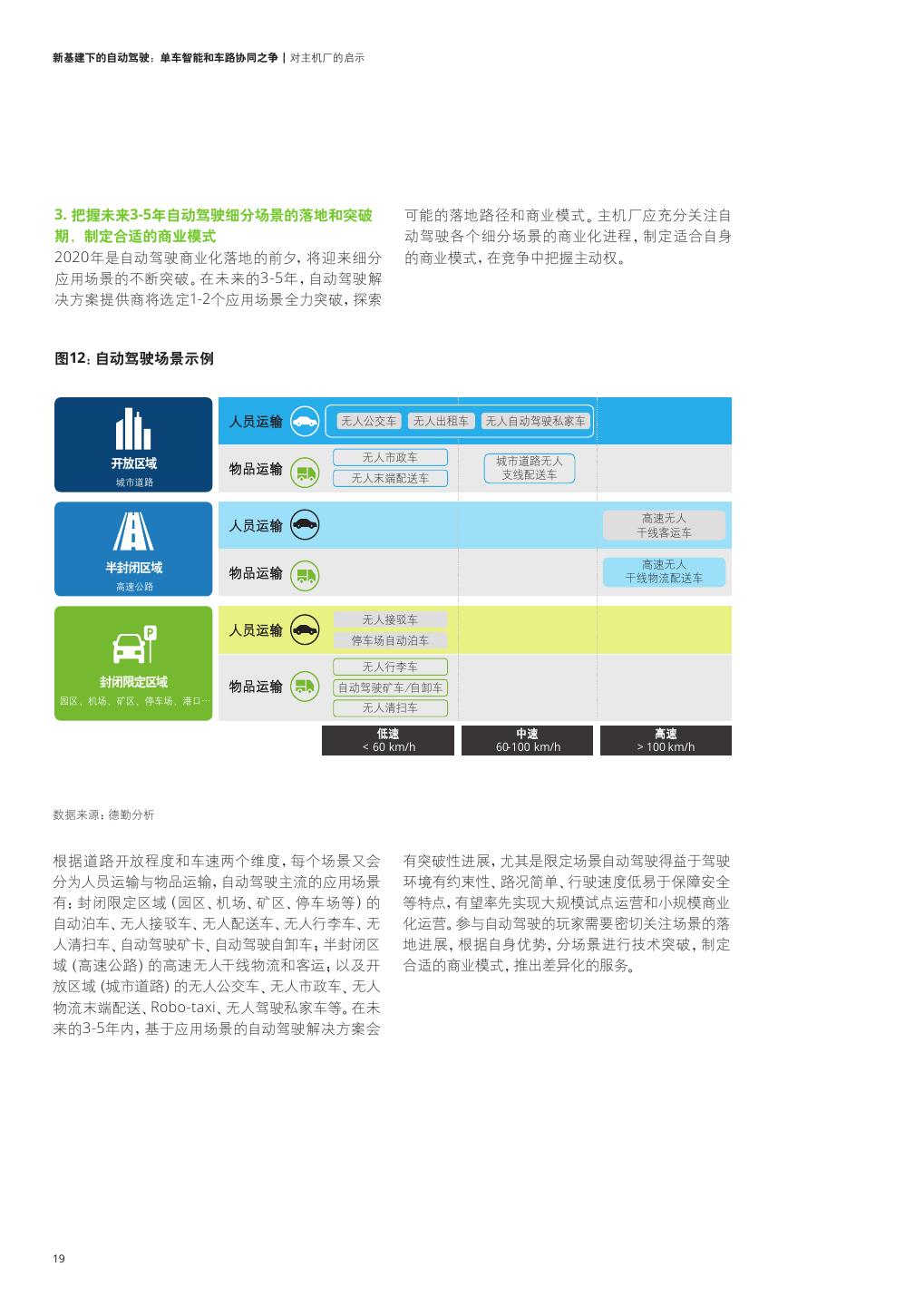 20 .新基建下的自动驾驶:单车智能和车路协同之争 | 对主机厂的启示 3. 把握未来3-5年自动驾驶细分场景的落地和突破 可能的落地路径和商业模式。主机厂应充分关注自 期,制定合适的商业模式 动驾驶各个细分场景的商业化进程,制定适合自身 2020年是自动驾驶商业化落地的前夕,将迎来细分 的商业模式,在竞争中把握主动权。 应用场景的不断突破。在未来的3-5年,自动驾驶解 决方案提供商将选定1-2个应用场景全力突破,探索 图12:自动驾驶场景示例 人员运输 无人公交车 无人出租车 无人自动驾驶私家车 无人市政车 城市道路无人 开放区域 物品运输 无人末端配送车 支线配送车 城市道路 高速无人 人员运输 干线客运车 半封闭区域 高速无人 物品运输 干线物流配送车 高速公路 无人接驳车 人员运输 停车场自动泊车 无人行李车 封闭限定区域 物品运输 自动驾驶矿车/自卸车 园区、机场、矿区、停车场、港口… 无人清扫车 低速 中速 高速 < 60 km/h 60-100 km/h > 100 km/h 数据来源:德勤分析 根据道路开放程度和车速两个维度,每个场景又会 有突破性进展,尤其是限定场景自动驾驶得益于驾驶 分为人员运输与物品运输,自动驾驶主流的应用场景 环境有约束性、路况简单、行驶速度低易于保障安全 有:封闭限定区域(园区、机场、矿区、停车场等)的 等特点,有望率先实现大规模试点运营和小规模商业 自动泊车、无人接驳车、无人配送车、无人行李车、无 化运营。参与自动驾驶的玩家需要密切关注场景的落 人清扫车、自动驾驶矿卡、自动驾驶自卸车;半封闭区 地进展,根据自身优势,分场景进行技术突破,制定 域(高速公路)的高速无人干线物流和客运;以及开 合适的商业模式,推出差异化的服务。 放区域(城市道路)的无人公交车、无人市政车、无人 物流末端配送、Robo-taxi、无人驾驶私家车等。在未 来的3-5年内,基于应用场景的自动驾驶解决方案会 19