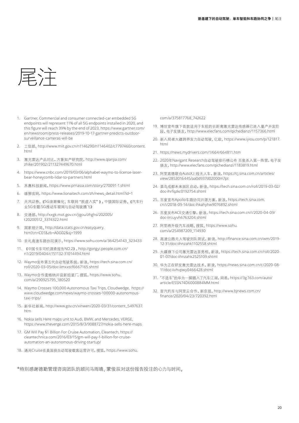 21 . 新基建下的自动驾驶:单车智能和车路协同之争 | 尾注 尾注 1. Gartner, Commercial and consumer connected-car embedded 5G com/a/375817768_742622 endpoints will represent 11% of all 5G endpoints installed in 2020, and 19. 博世宣布旗下首款适用于车规的长距离激光雷达传感器已进入量产开发阶 this figure will reach 39% by the end of 2023, https://www.gartner.com/ 段,电子发烧友,http://www.elecfans.com/qichedianzi/1157366.html en/newsroom/press-releases/2019-10-17-gartner-predicts-outdoor- surveillance-cameras-will-be 20. 新入局者大疆跨界发力自动驾驶,亿欧,https://www.iyiou.com/p/121817. html 2. 工信部,http://www.miit.gov.cn/n1146290/n1146402/c7797460/content. html 21. https://news.mydrivers.com/1/664/664811.htm 3. 激光雷达产品对比,方象知产研究院,http://www.qianjia.com/ 22. 2020年Navigant Research自动驾驶排行榜公布 百度杀入第一阵营,电子发 zhike/201902/211327449670.html 烧友,http://www.elecfans.com/qichedianzi/1183819.html 4. https://www.cnbc.com/2019/03/06/alphabet-waymo-to-license-laser- 23. 阿里高德联合AutoX上线无人车,新浪,https://cj.sina.com.cn/articles/ bear-honeycomb-lidar-to-partners.html view/2853016445/aa0d937d02000m7pt 5. 禾赛科技新闻,https://www.prnasia.com/story/270091-1.shtml 24. 菜鸟成都未来园区启动,新浪,https://tech.sina.com.cn/roll/2019-03-02/ doc-ihrfqzkc0192754.shtml 6. 雄狮官网,https://www.lionaitech.com/zh/news_detail.html?id=1 25. 百度宣布Apollo车路协同开源方案,新浪,https://tech.sina.com. 7. 天风证券, 《5G浪潮催化,车联网“脱虚入实”》;中银国际证券, 《汽车行 cn/i/2018-09-14/doc-ihkahyhw9076892.shtml 业5G专题:5G推动车联网与自动驾驶腾飞》 26. 百度发布ACE交通引擎,新浪,https://tech.sina.com.cn/i/2020-04-09/ 8. 交通部,http://xxgk.mot.gov.cn/jigou/zhghs/202005/ doc-iircuyvh6763204.shtml t20200512_3374322.html 27. 阿里将升级汽车战略,搜狐,https://www.sohu. 9. 国家统计局,http://data.stats.gov.cn/easyquery. com/a/254987209_114930 htm?cn=C01&zb=A0G02&sj=1999 28. 高速公路无人驾驶列队测试,新浪,http://finance.sina.com.cn/wm/2019- 10. 京礼高速车路协同演示,https://www.sohu.com/a/364254143_323433 12-31/doc-iihnzahk1102558.shtml 11. 《中国卡车司机调查报告NO.2》,http://gongyi.people.com.cn/ 29. 大疆旗下公司激光雷达首亮相,新浪,https://tech.sina.com.cn/roll/2020- n1/2019/0404/c151132-31014494.html 01-07/doc-iihnzahk2525109.shtml 12. Waymo发布第五代自动驾驶系统,新浪,https://tech.sina.com.cn/ 30. 华为正在研发激光雷达技术,新浪,https://news.sina.com.cn/c/2020-08- roll/2020-03-05/doc-iimxxstf6667165.shtml 11/doc-iivhvpwy0466428.shtml 13. Waymo合作麦格纳开设新组装厂,搜狐,https://www.sohu. 31. "不造车"的华为一脚踏入了汽车江湖,网易,https://3g.163.com/auto/ com/a/290925795_180520 article/ESSN74D6000884MM.html 14. Waymo Crosses 100,000 Autonomous Taxi Trips, Cloudwedge, https:// 32. 首汽约车与阿里云合作,新京报,http://www.bjnews.com.cn/ www.cloudwedge.com/news/waymo-crosses-100000-autonomous- finance/2020/04/23/720392.html taxi-trips/ 15. 新华社新闻,http://www.gov.cn/xinwen/2020-03/31/content_5497637. htm 16. Nokia sells Here maps unit to Audi, BMW, and Mercedes, VERGE, https://www.theverge.com/2015/8/3/9088727/nokia-sells-here-maps 17. GM Will Pay $1 Billion For Cruise Automation, Cleantech, https:// cleantechnica.com/2016/03/15/gm-will-pay-1-billion-for-cruise- automation-an-autonomous-driving-startup/ 18. 通用Cruise在美国获自动驾驶载客运营许可,搜狐,https://www.sohu. *特别感谢德勤管理咨询团队的顾问马雨晴、蒙俊辰对这份报告投注的心力与时间。 20