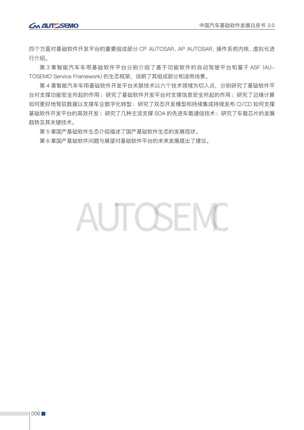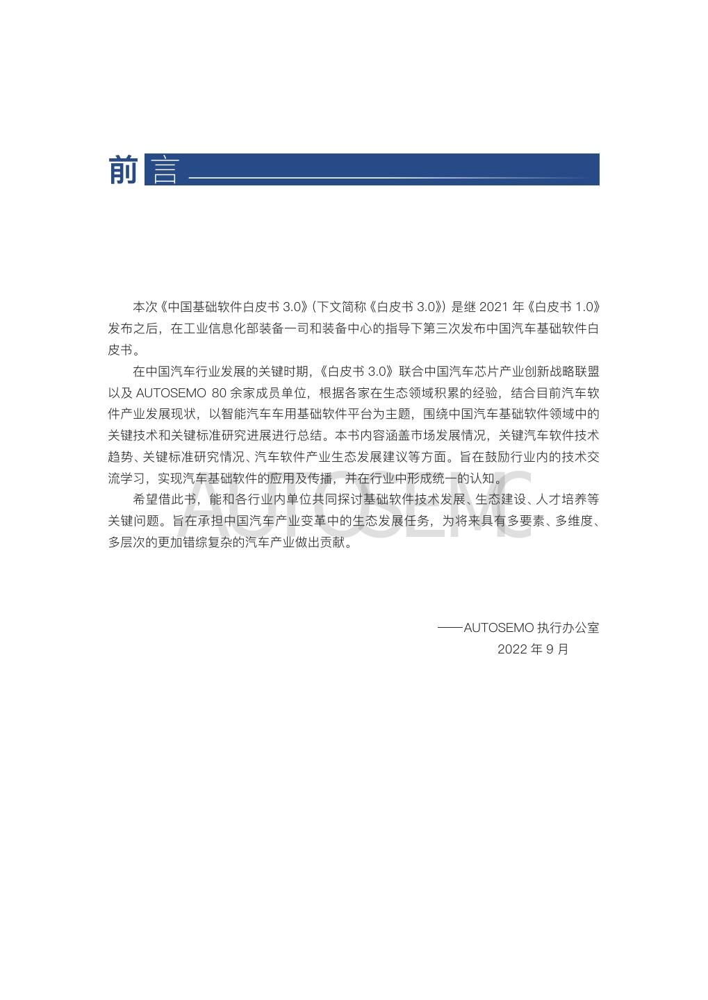 3 .前言 本次《中国基础软件白皮书 3.0》 (下文简称《白皮书 3.0》)是继 2021 年《白皮书 1.0》 发布之后,在工业信息化部装备一司和装备中心的指导下第三次发布中国汽车基础软件白 皮书。 在中国汽车行业发展的关键时期,《白皮书 3.0》联合中国汽车芯片产业创新战略联盟 以及 AUTOSEMO 80 余家成员单位,根据各家在生态领域积累的经验,结合目前汽车软 件产业发展现状,以智能汽车车用基础软件平台为主题,围绕中国汽车基础软件领域中的 关键技术和关键标准研究进展进行总结。本书内容涵盖市场发展情况,关键汽车软件技术 趋势、关键标准研究情况、汽车软件产业生态发展建议等方面。旨在鼓励行业内的技术交 AUTOSEMO 流学习,实现汽车基础软件的应用及传播,并在行业中形成统一的认知。 希望借此书,能和各行业内单位共同探讨基础软件技术发展、生态建设、人才培养等 关键问题。旨在承担中国汽车产业变革中的生态发展任务,为将来具有多要素、多维度、 多层次的更加错综复杂的汽车产业做出贡献。 —— AUTOSEMO 执行办公室 2022 年 9 月