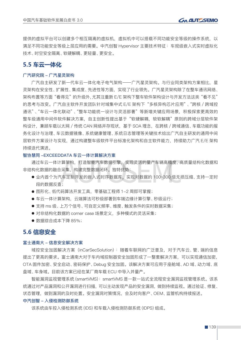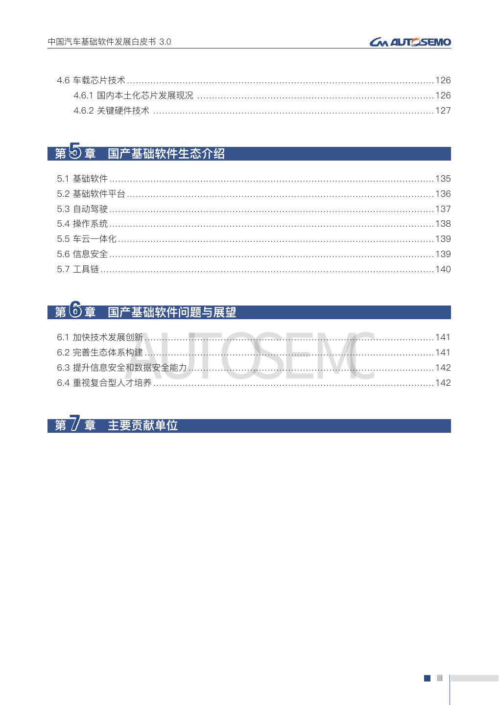 6 .中国汽车基础软件发展白皮书 3.0 4.6 车载芯片技术�����������������������������������126 4.6.1 国内本土化芯片发展现况���������������������������126 4.6.2 关键硬件技术��������������������������������127 第 5章 国产基础软件生态介绍 5.1 基础软件�������������������������������������135 5.2 基础软件平台�����������������������������������136 5.3 自动驾驶�������������������������������������137 5.4 操作系统�������������������������������������138 5.5 车云一体化������������������������������������139 5.6 信息安全�������������������������������������139 5.7 工具链��������������������������������������140 第 6章 国产基础软件问题与展望 AUTOSEMO 6.1 加快技术发展创新���������������������������������141 6.2 完善生态体系构建���������������������������������141 6.3 提升信息安全和数据安全能力����������������������������142 6.4 重视复合型人才培养��������������������������������142 第 7章 主要贡献单位 III